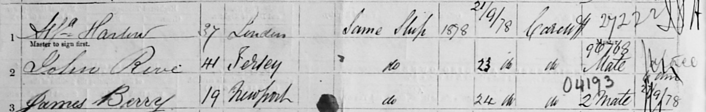 The certificate numbers for masters and mates were frequently shown against their names on crew lists, as shown in Figure 1. The master's certificate number is also shown on the header of the document - see Figure 2. As mentioned above, not all masters had certificates and Figure 3 illustrates this point.