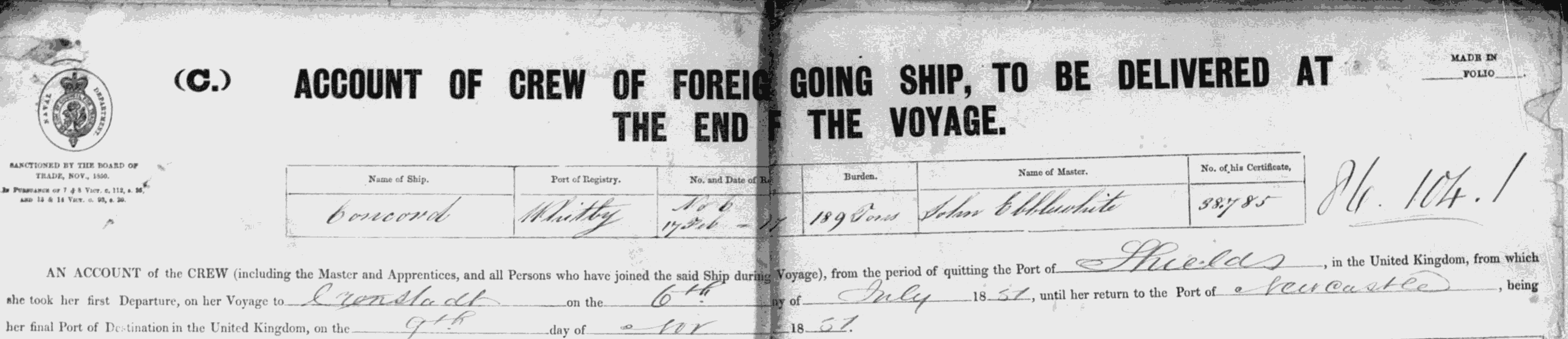 Newspapers can also be used to fill in details - for example, there is a newspaper report of the Concord arriving in Gothenburg from Woodbridge on 25 September 1853.