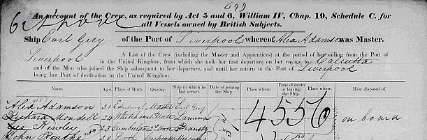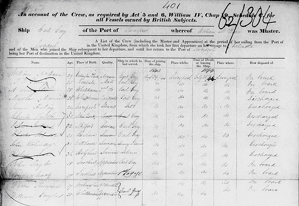 Figure 8 shows a crew list for the ship Earl Grey of Liverpool for a voyage to Calcutta which began on the 29 August 1843 and ended in Liverpool on 25 July 1844 when the document was handed to the collector at that port.