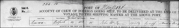 Figure 10 shows a crew list for the ship Emma of Belfast for a foreign-going voyage commencing 15 March 1855 - just before the system of official numbers came into use. Her official number, 22965 can be seen on the form. It was allocated at Newport when she arrived there in June, as noted in the Appropriation Books.