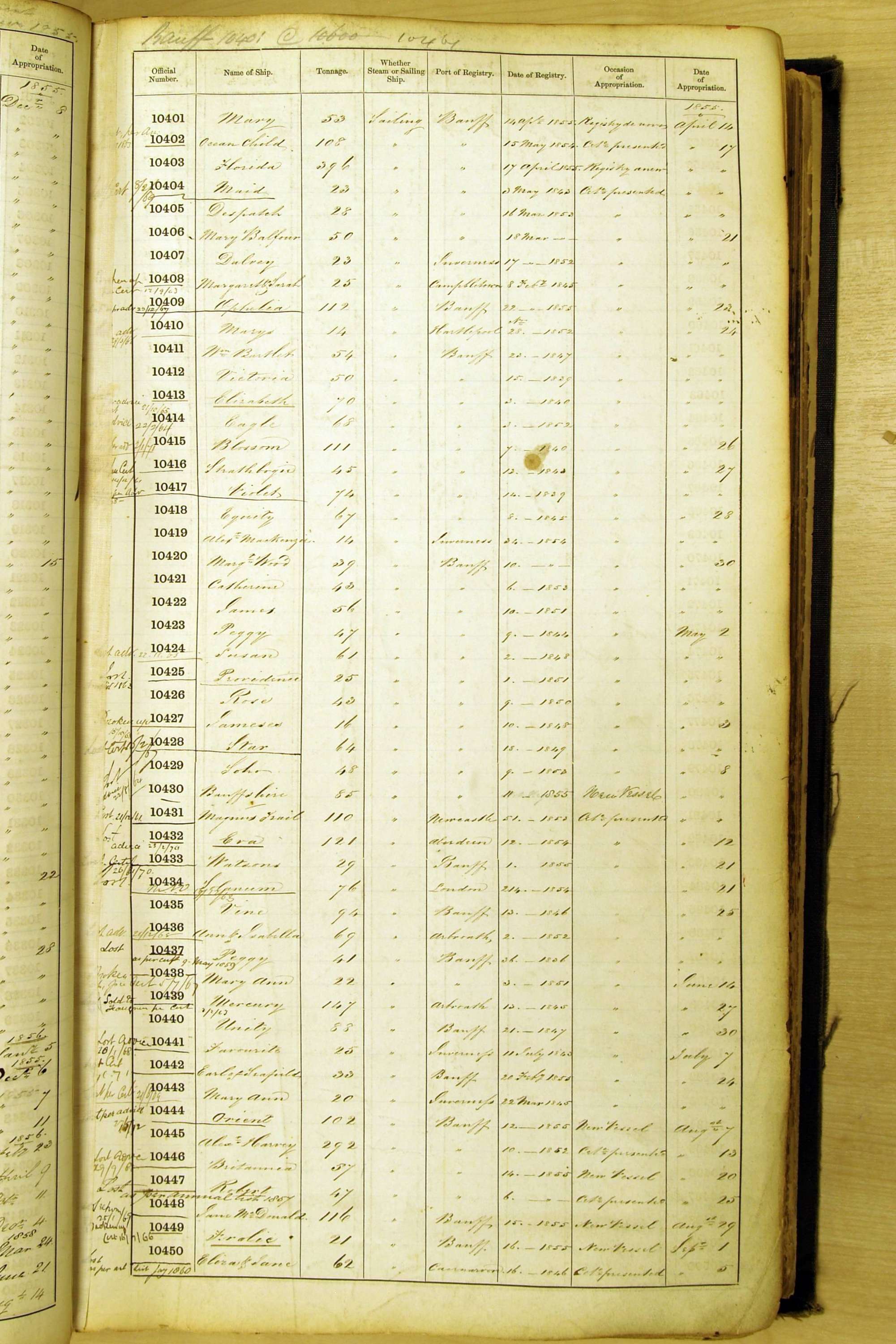 When the system of official numbers began on 16 April 1855, the British Ports of Registry were each allocated batches of official numbers. For official numbers up to 22200 you can see this allocation as a pencil note at the top of the page where the allocation began. A summary of the first allocation is shown here: Initial allocation of official numbers