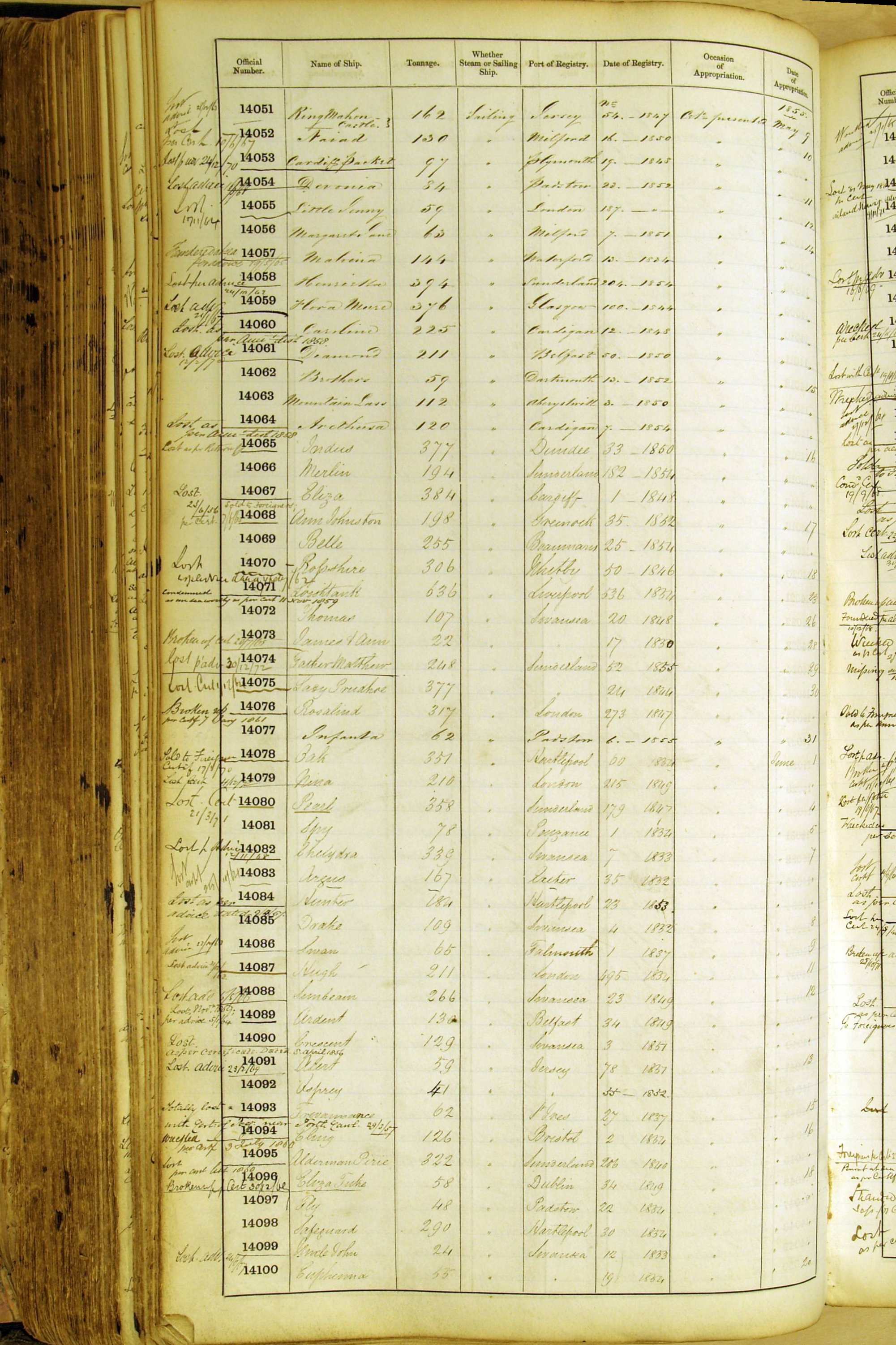 Especially in the first volume, there are frequent margin annotations against the entries which (if you can decipher them) can provide information on the ultimate fate of the ship. Typical entries are 'Lost as per cert[ificate] 20/6/58' or 'Sold foreigners per advice 8/4/67'. Beware - it is sometimes not easy to see which entry it refers to. However, these annotations may be a useful quick alternative to consulting the original Shipping Registers.