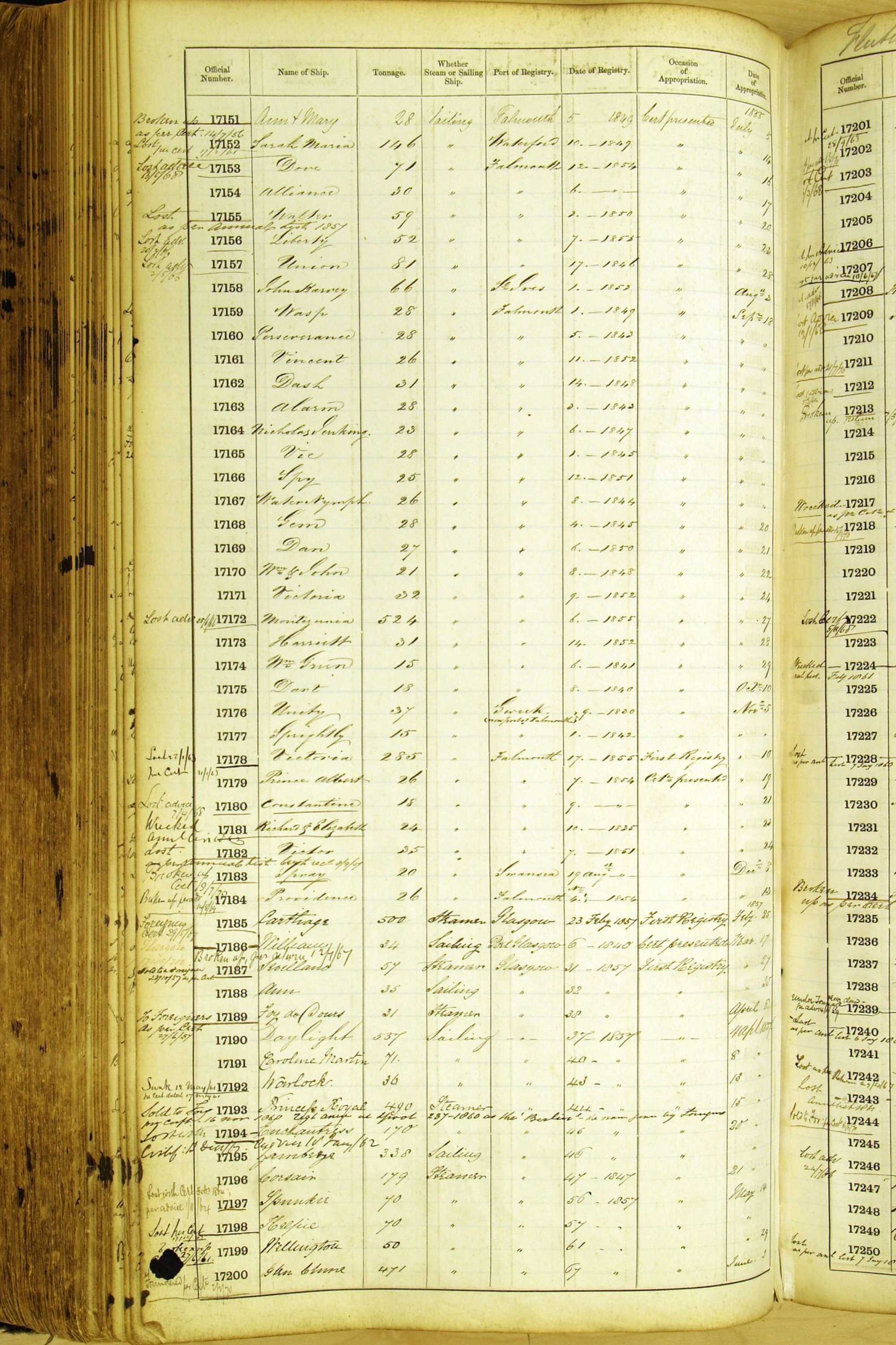 Especially in the first volume, there are frequent margin annotations against the entries which (if you can decipher them) can provide information on the ultimate fate of the ship. Typical entries are 'Lost as per cert[ificate] 20/6/58' or 'Sold foreigners per advice 8/4/67'. Beware - it is sometimes not easy to see which entry it refers to. However, these annotations may be a useful quick alternative to consulting the original Shipping Registers.