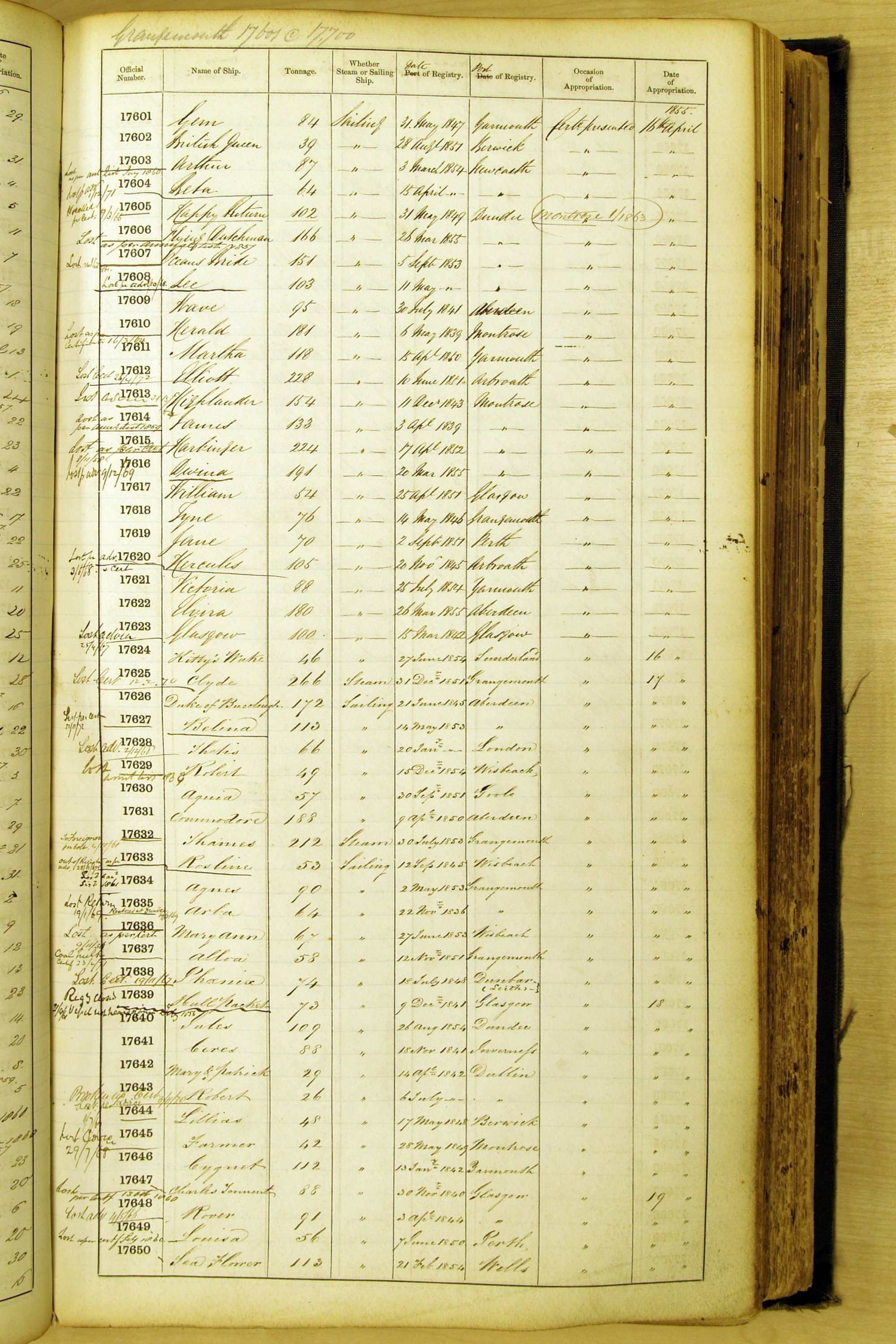 Bear in mind that the ships names in the Appropriation Books are not the definitive name or spelling of the name, even though these are the central records for the whole system. As you can see, the entries are hand-written and derived from hand-written returns made by the various ports, themselves based on the hand-written shipping registers, based on what the port officials thought the person registering the ship was saying or had hand-written down.