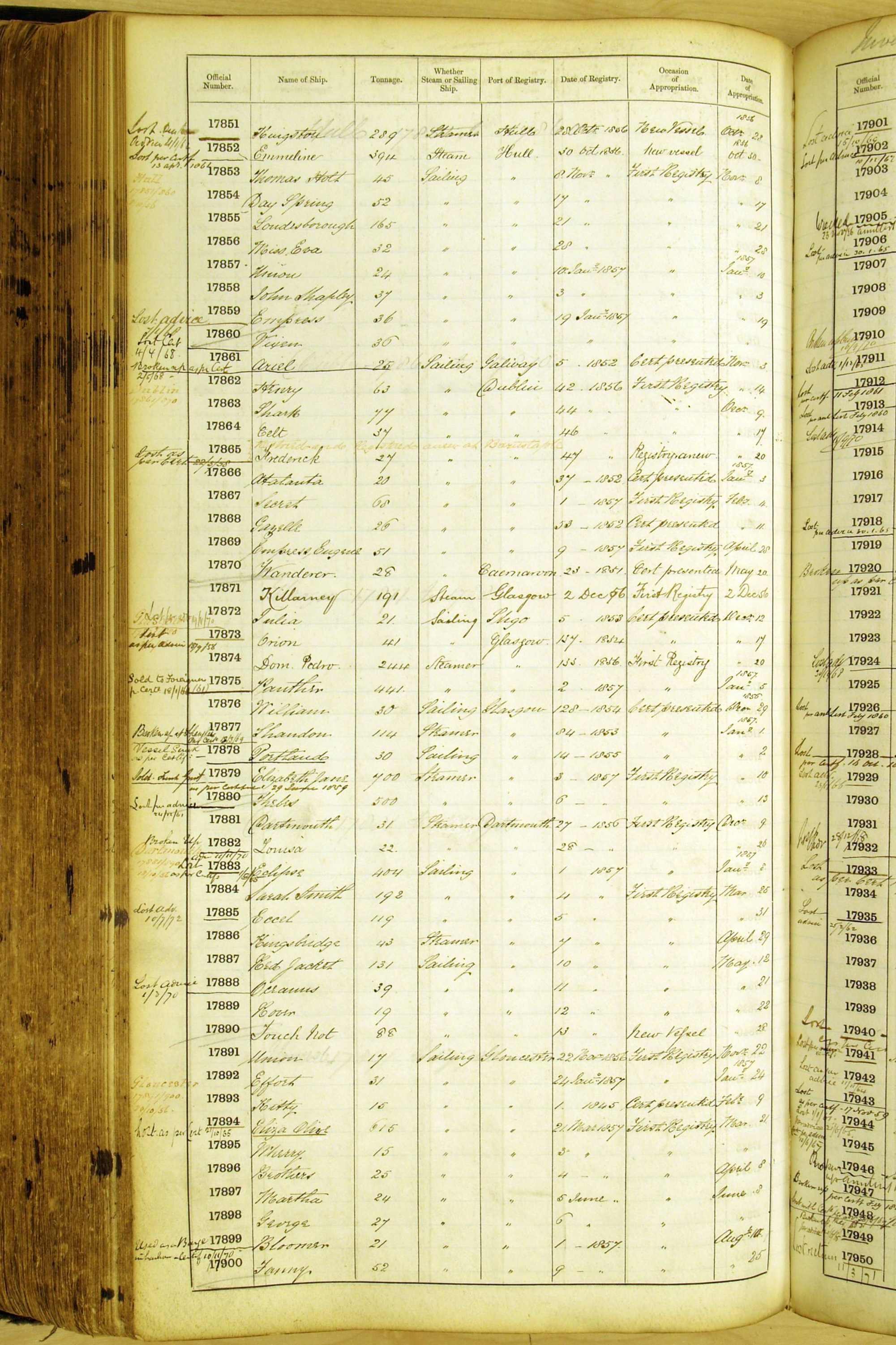 Especially in the first volume, there are frequent margin annotations against the entries which (if you can decipher them) can provide information on the ultimate fate of the ship. Typical entries are 'Lost as per cert[ificate] 20/6/58' or 'Sold foreigners per advice 8/4/67'. Beware - it is sometimes not easy to see which entry it refers to. However, these annotations may be a useful quick alternative to consulting the original Shipping Registers.
