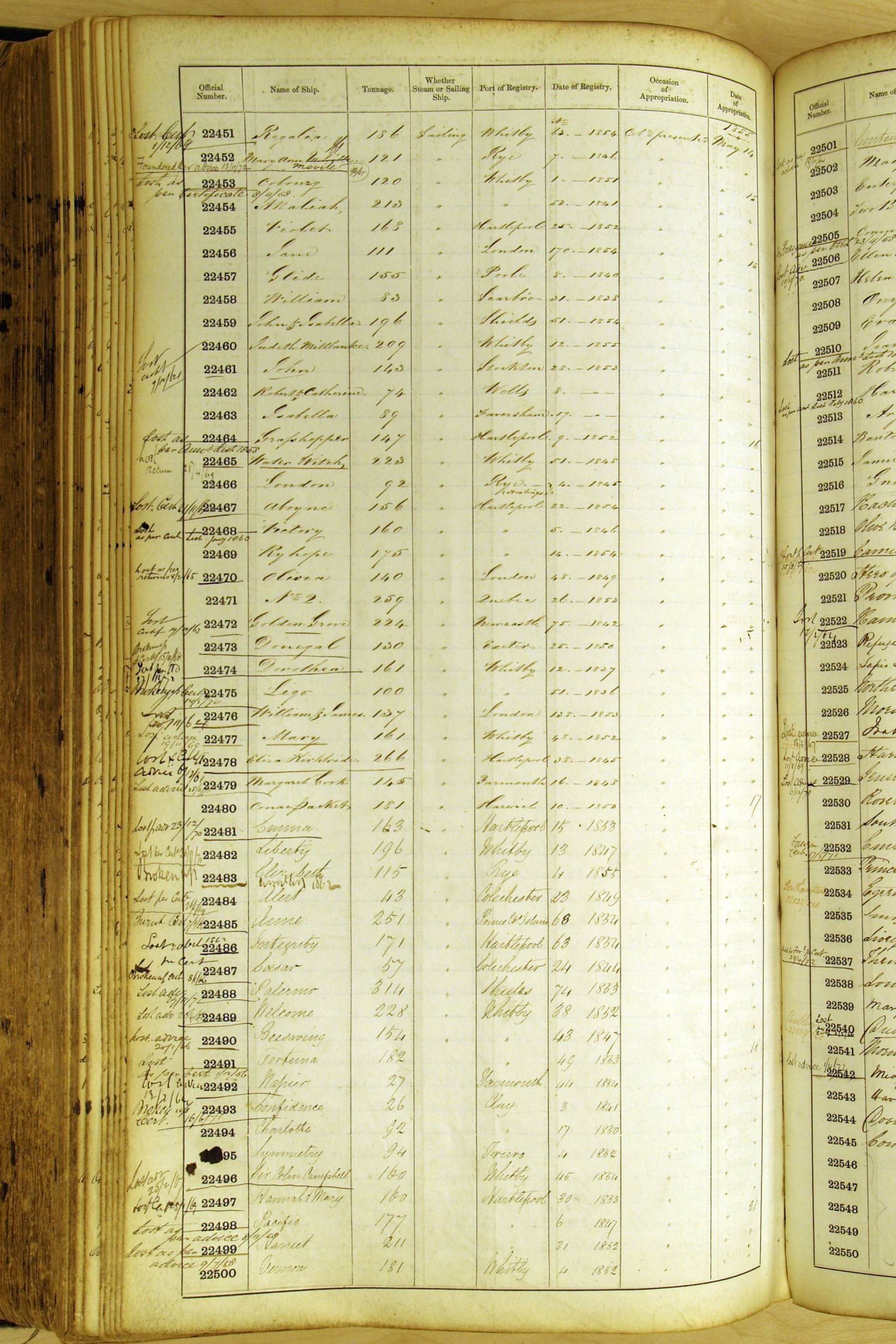 Especially in the first volume, there are frequent margin annotations against the entries which (if you can decipher them) can provide information on the ultimate fate of the ship. Typical entries are 'Lost as per cert[ificate] 20/6/58' or 'Sold foreigners per advice 8/4/67'. Beware - it is sometimes not easy to see which entry it refers to. However, these annotations may be a useful quick alternative to consulting the original Shipping Registers.