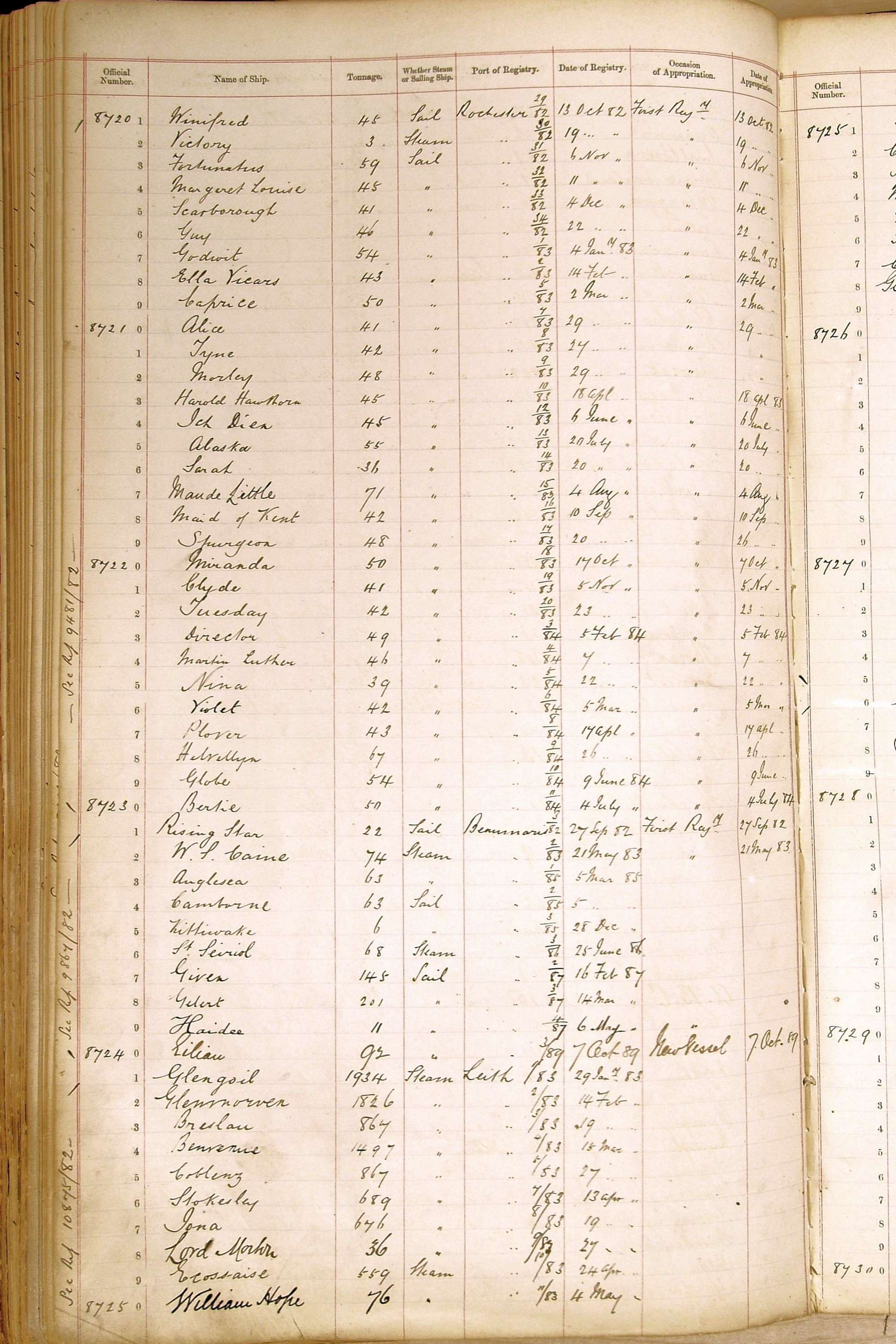 When the system of official numbers began on 16 April 1855, the British Ports of Registry were each allocated batches of official numbers. For official numbers up to 22200 you can see this allocation as a pencil note at the top of the page where the allocation began. A summary of the first allocation is shown here: Initial allocation of official numbers