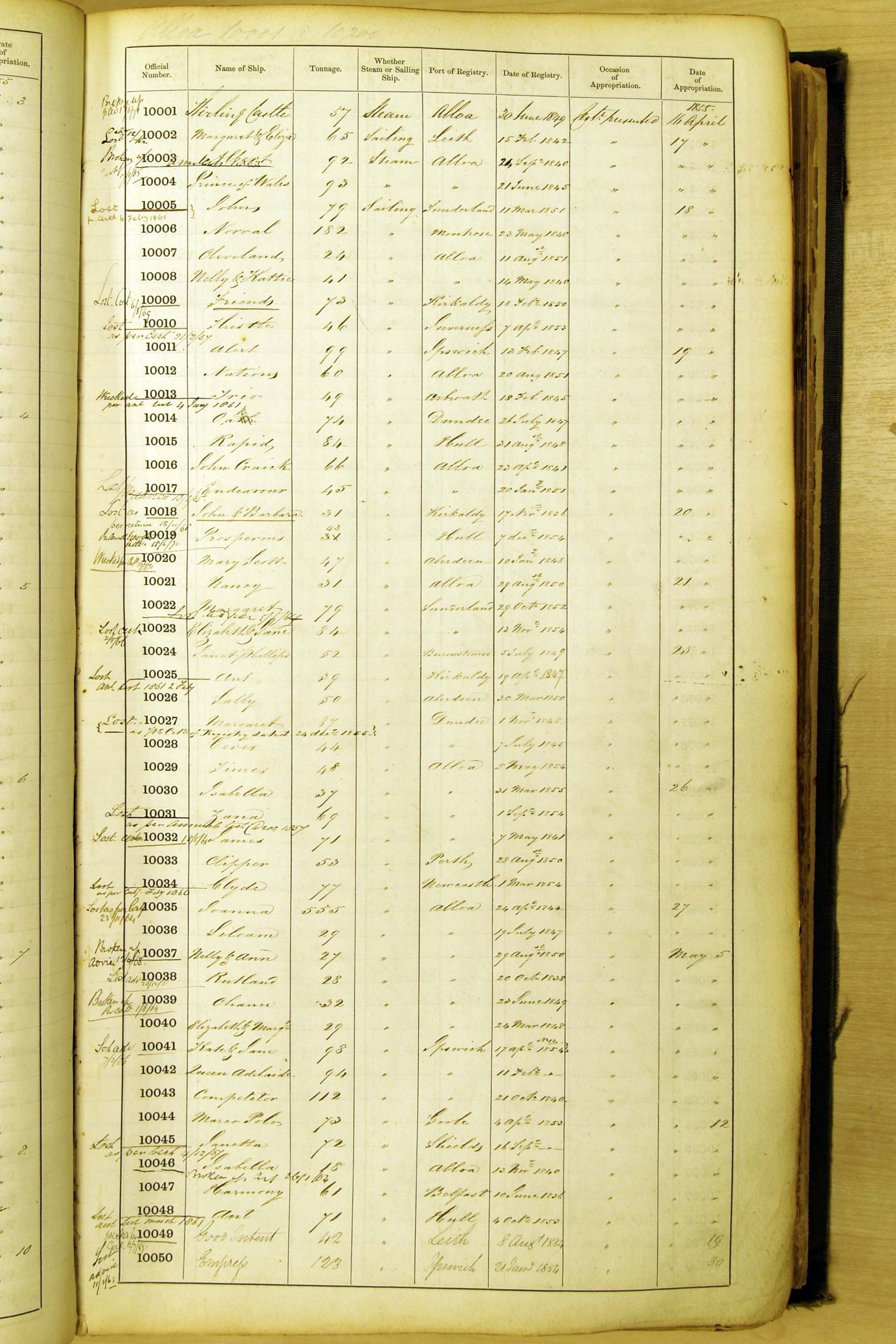 Especially in the first volume, there are frequent margin annotations against the entries which (if you can decipher them) can provide information on the ultimate fate of the ship. Typical entries are 'Lost as per cert[ificate] 20/6/58' or 'Sold foreigners per advice 8/4/67'. Beware - it is sometimes not easy to see which entry it refers to. However, these annotations may be a useful quick alternative to consulting the original Shipping Registers.