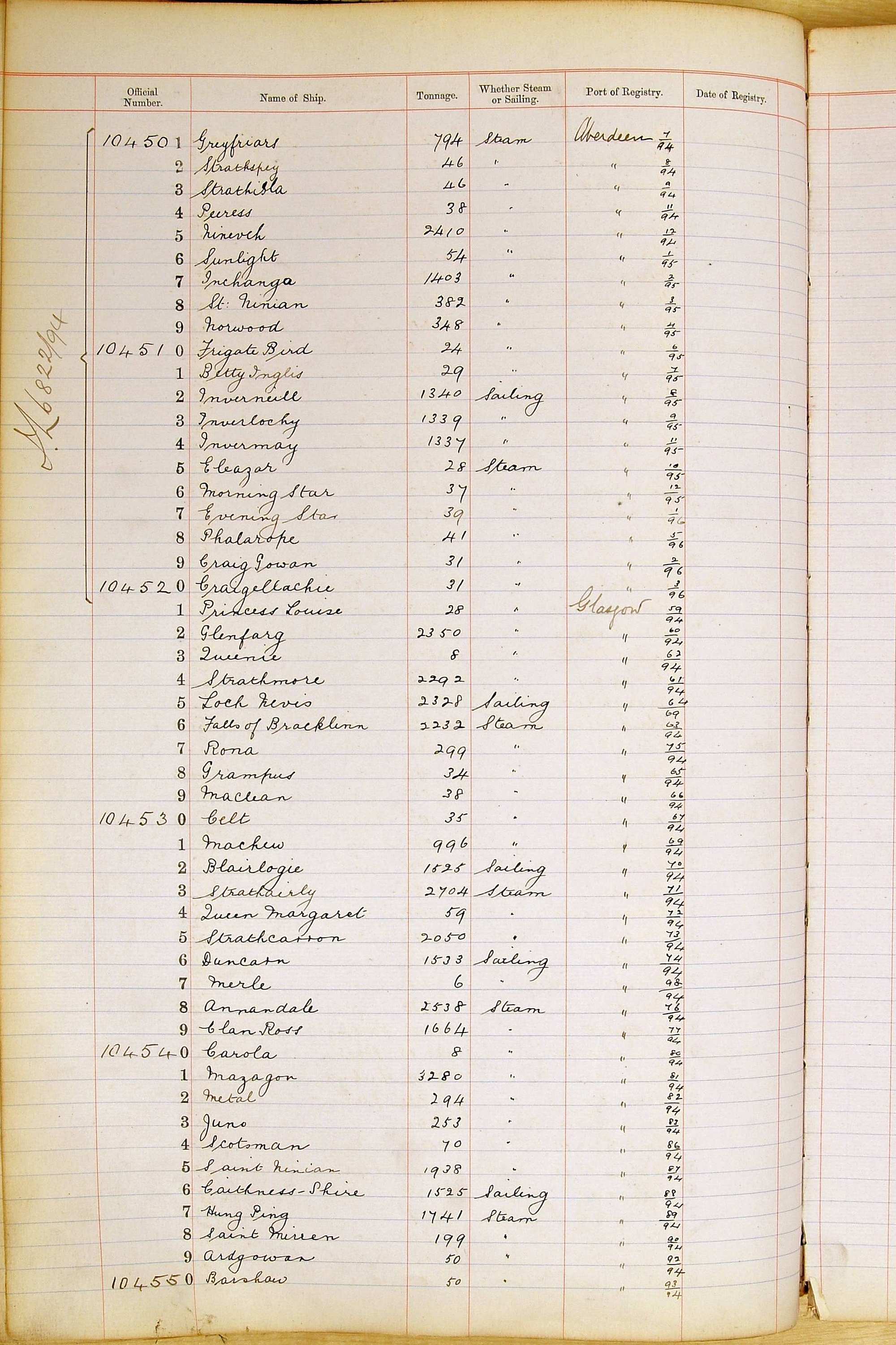When the system of official numbers began on 16 April 1855, the British Ports of Registry were each allocated batches of official numbers. For official numbers up to 22200 you can see this allocation as a pencil note at the top of the page where the allocation began. A summary of the first allocation is shown here: Initial allocation of official numbers