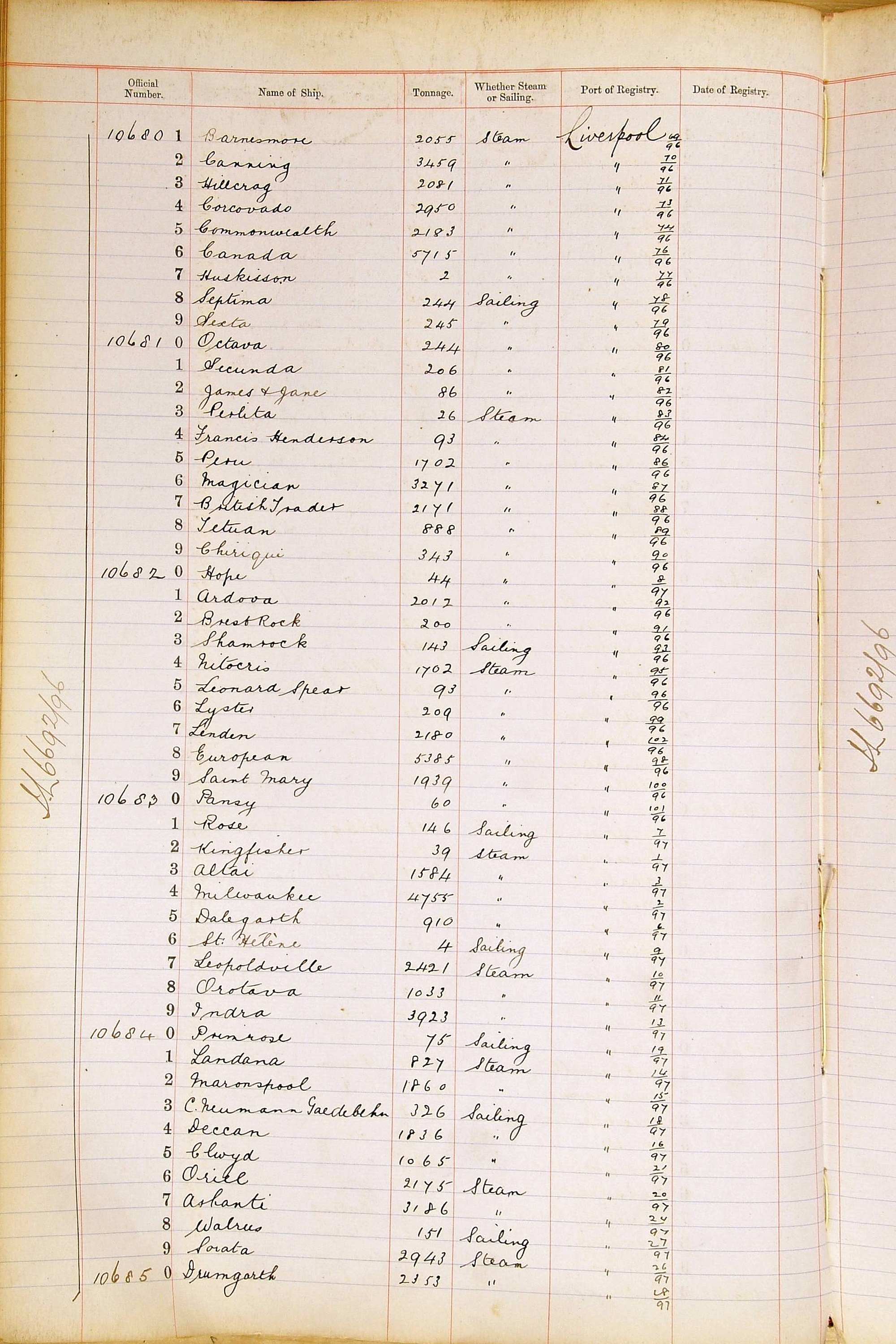 When the system of official numbers began on 16 April 1855, the British Ports of Registry were each allocated batches of official numbers. For official numbers up to 22200 you can see this allocation as a pencil note at the top of the page where the allocation began. A summary of the first allocation is shown here: Initial allocation of official numbers