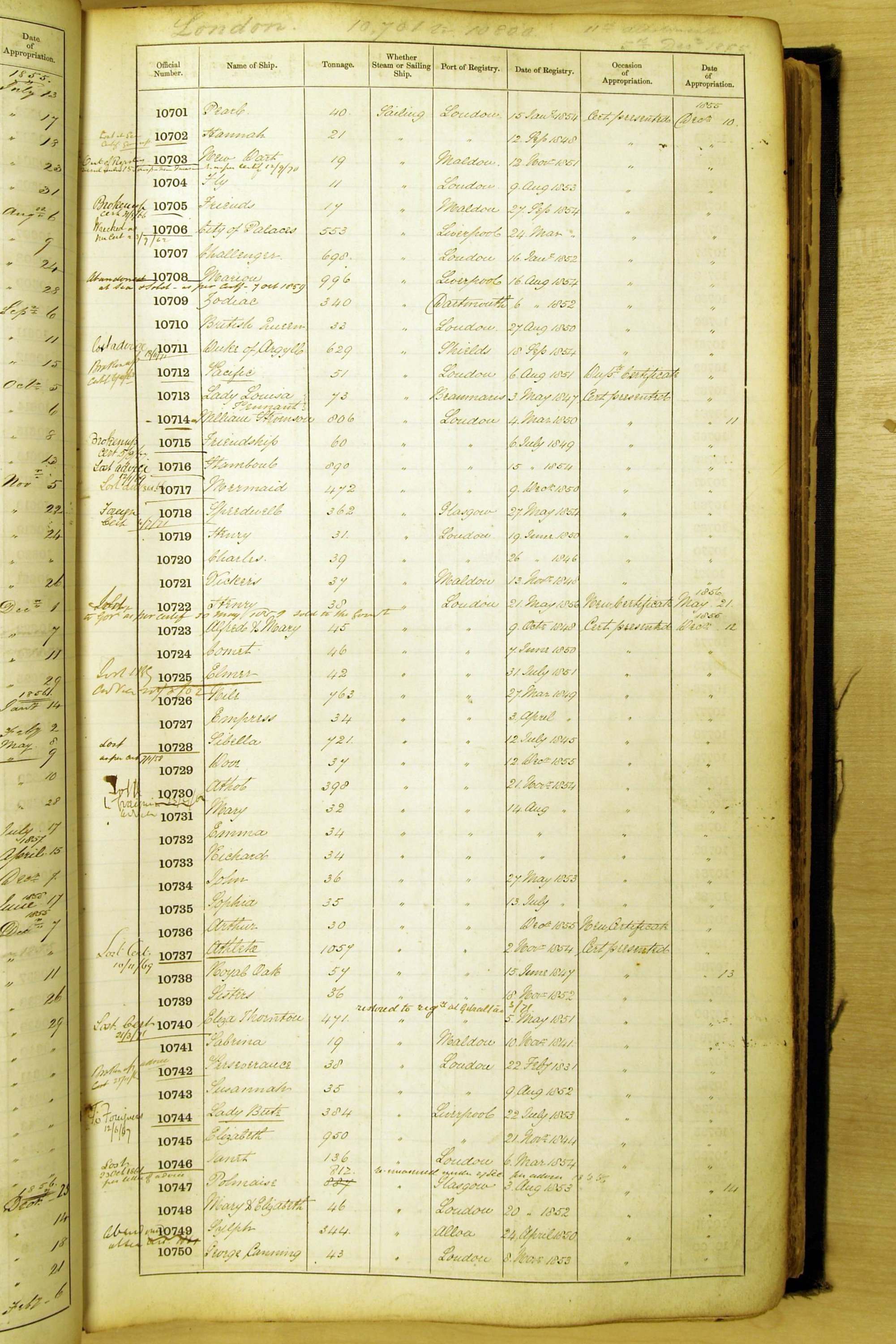 Bear in mind that the ships names in the Appropriation Books are not the definitive name or spelling of the name, even though these are the central records for the whole system. As you can see, the entries are hand-written and derived from hand-written returns made by the various ports, themselves based on the hand-written shipping registers, based on what the port officials thought the person registering the ship was saying or had hand-written down.