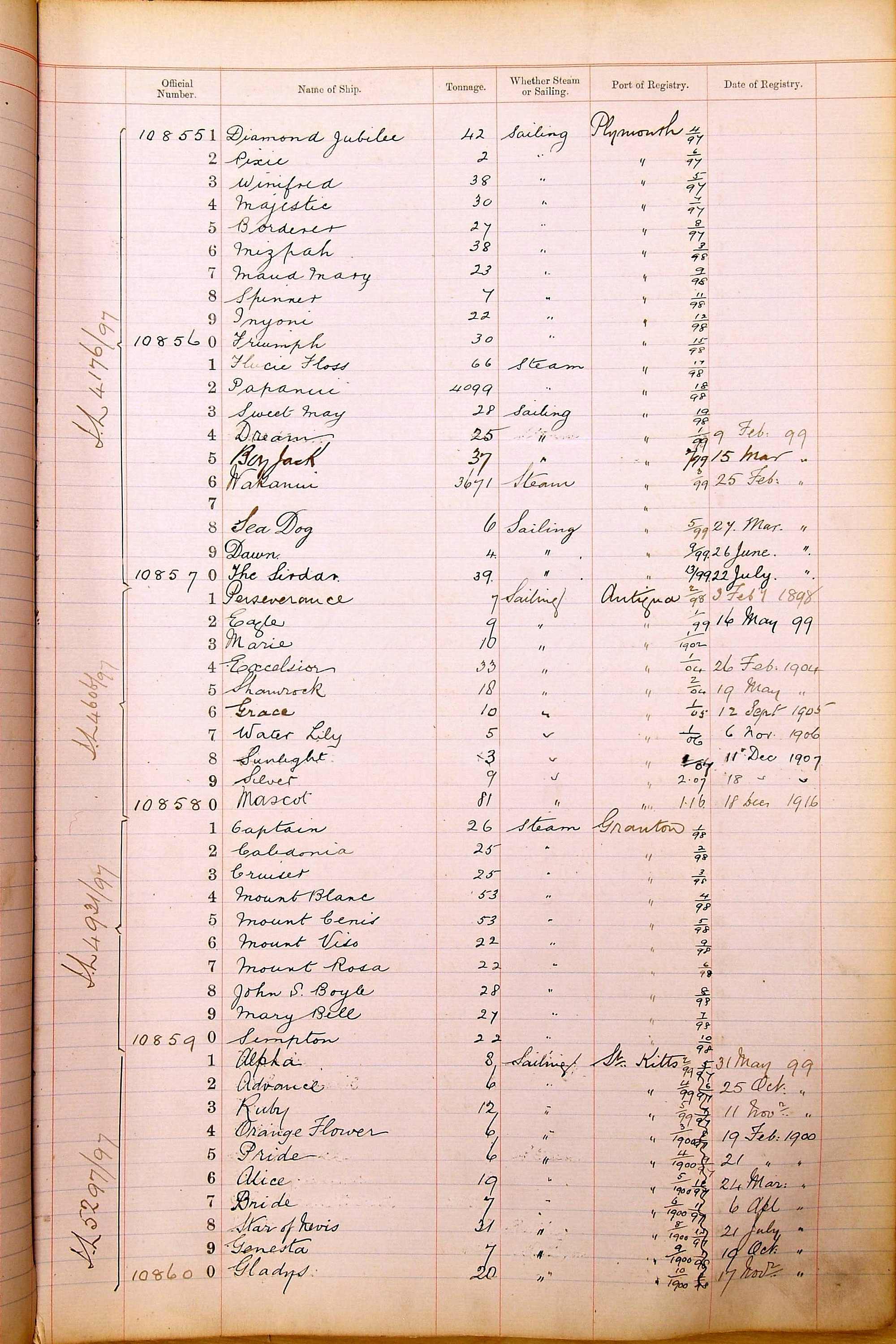 When the system of official numbers began on 16 April 1855, the British Ports of Registry were each allocated batches of official numbers. For official numbers up to 22200 you can see this allocation as a pencil note at the top of the page where the allocation began. A summary of the first allocation is shown here: Initial allocation of official numbers