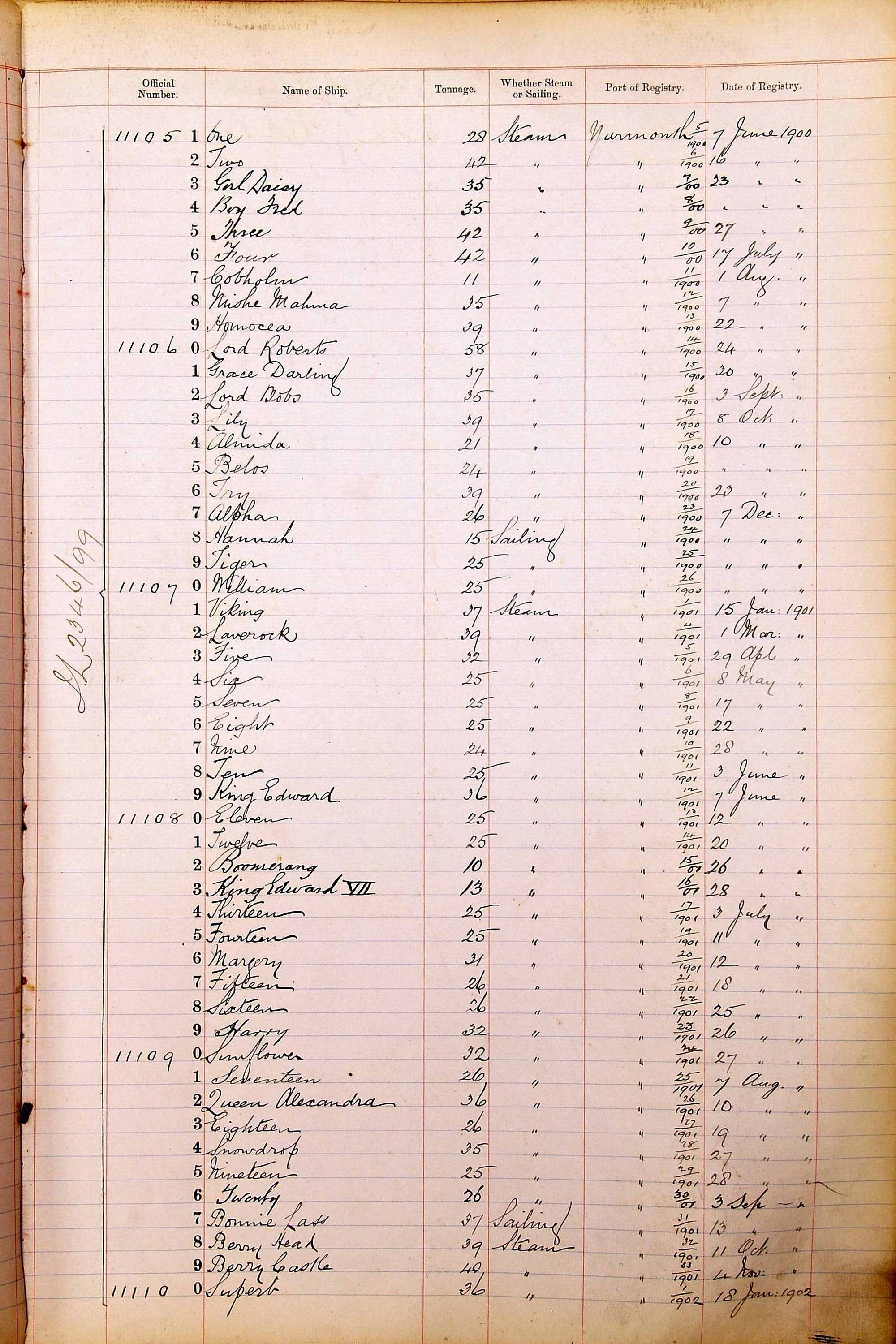 When the system of official numbers began on 16 April 1855, the British Ports of Registry were each allocated batches of official numbers. For official numbers up to 22200 you can see this allocation as a pencil note at the top of the page where the allocation began. A summary of the first allocation is shown here: Initial allocation of official numbers