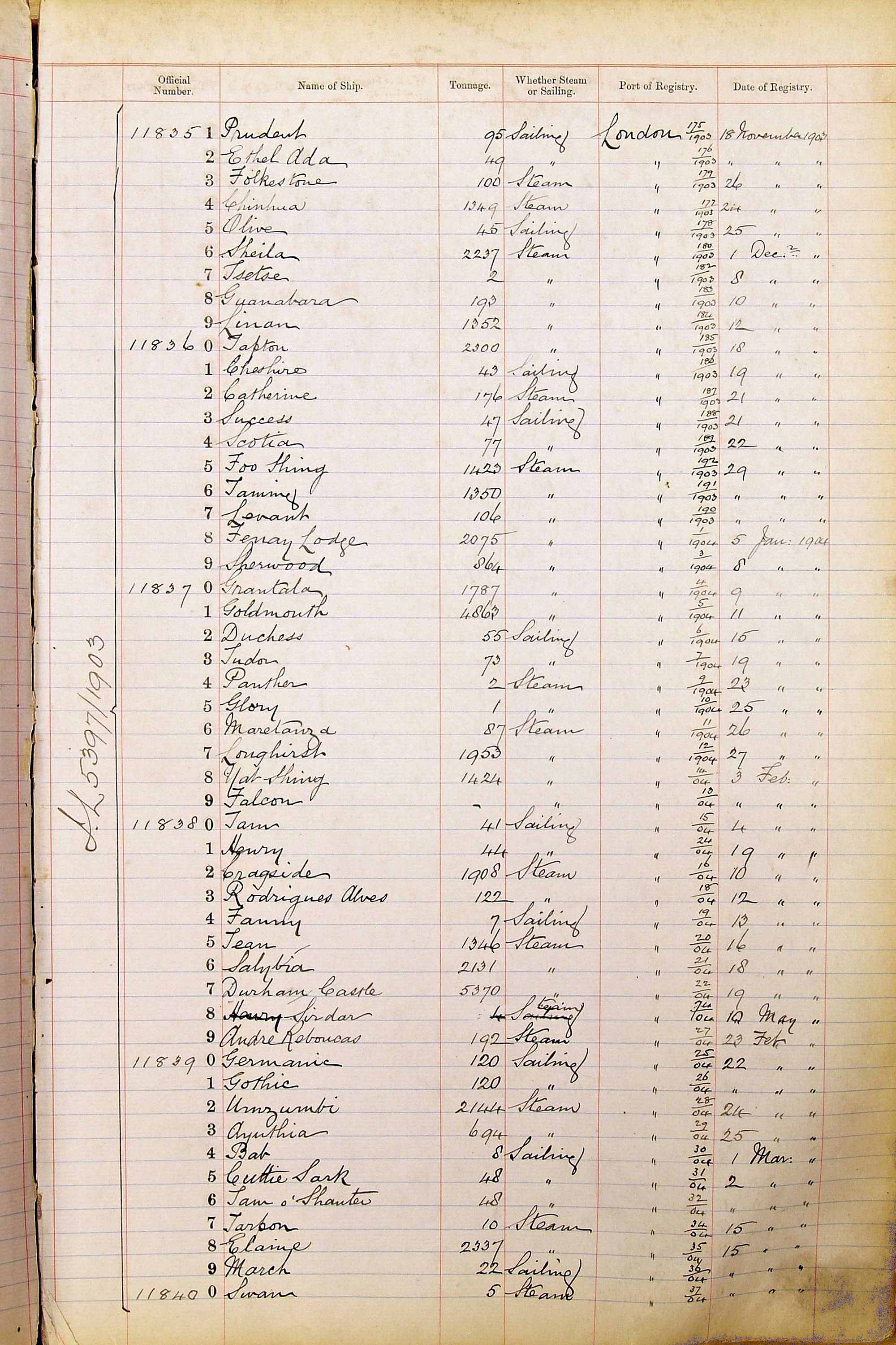 When the system of official numbers began on 16 April 1855, the British Ports of Registry were each allocated batches of official numbers. For official numbers up to 22200 you can see this allocation as a pencil note at the top of the page where the allocation began. A summary of the first allocation is shown here: