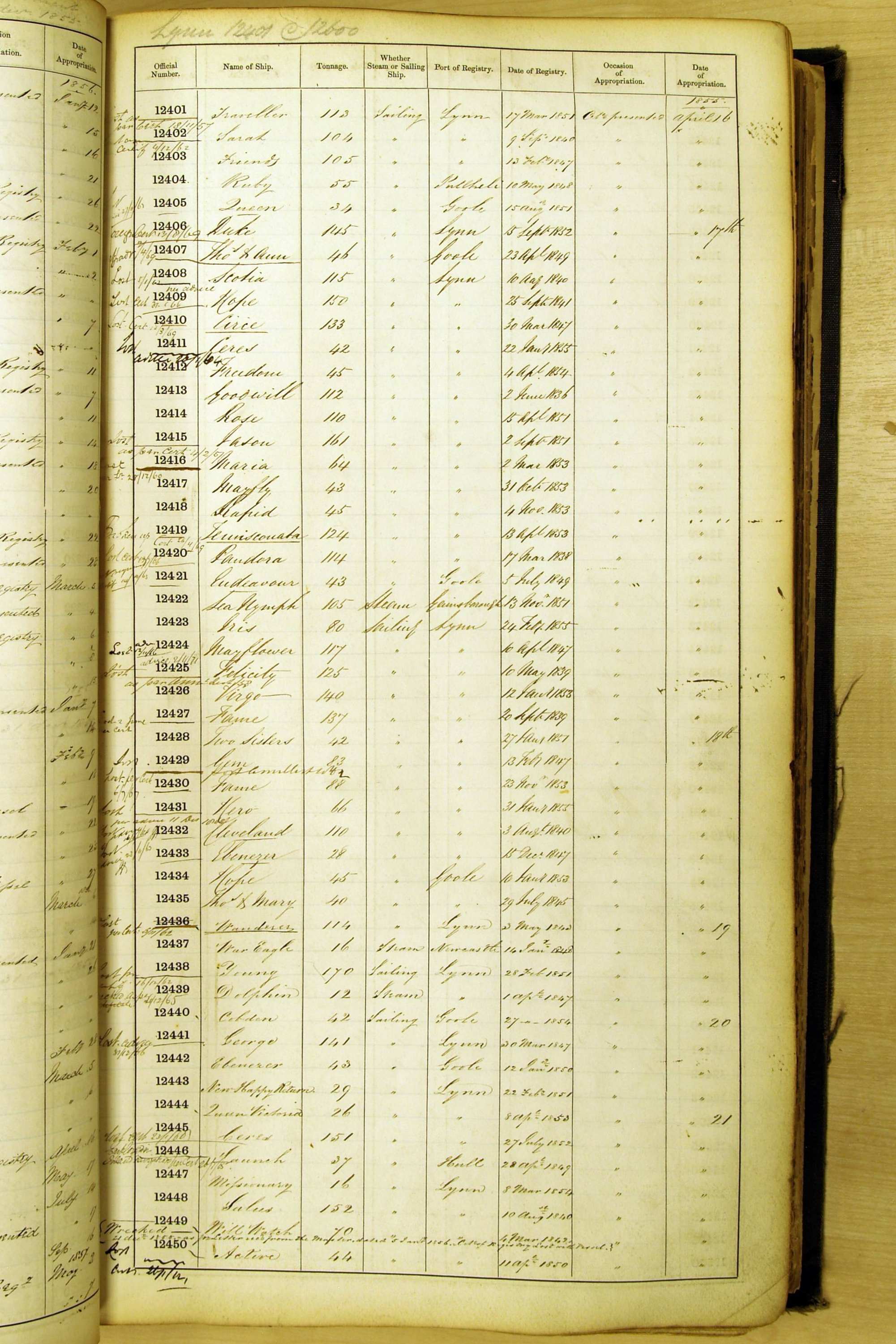 Bear in mind that the ships names in the Appropriation Books are not the definitive name or spelling of the name, even though these are the central records for the whole system. As you can see, the entries are hand-written and derived from hand-written returns made by the various ports, themselves based on the hand-written shipping registers, based on what the port officials thought the person registering the ship was saying or had hand-written down.
