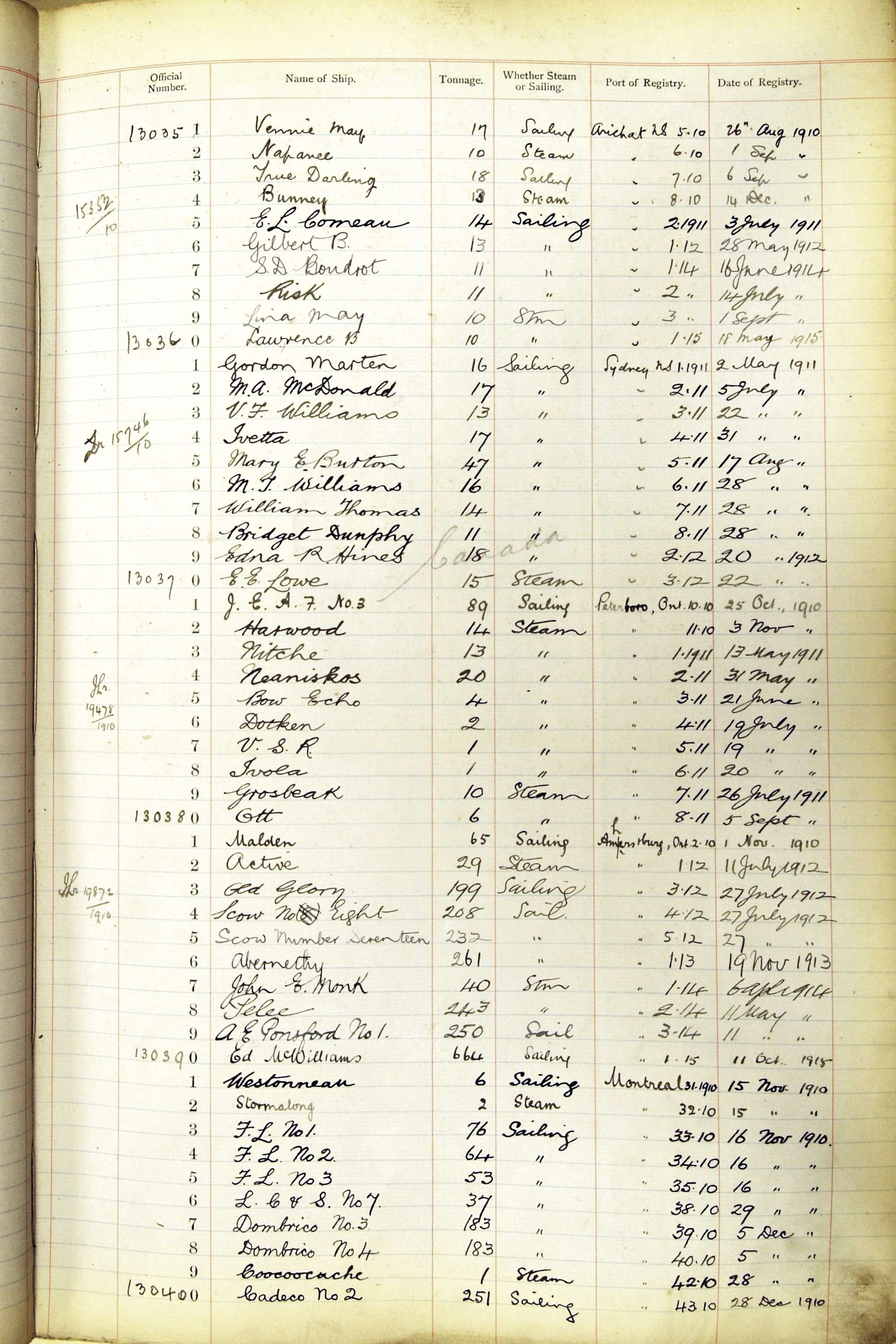 When the system of official numbers began on 16 April 1855, the British Ports of Registry were each allocated batches of official numbers. For official numbers up to 22200 you can see this allocation as a pencil note at the top of the page where the allocation began. A summary of the first allocation is shown here: Initial allocation of official numbers