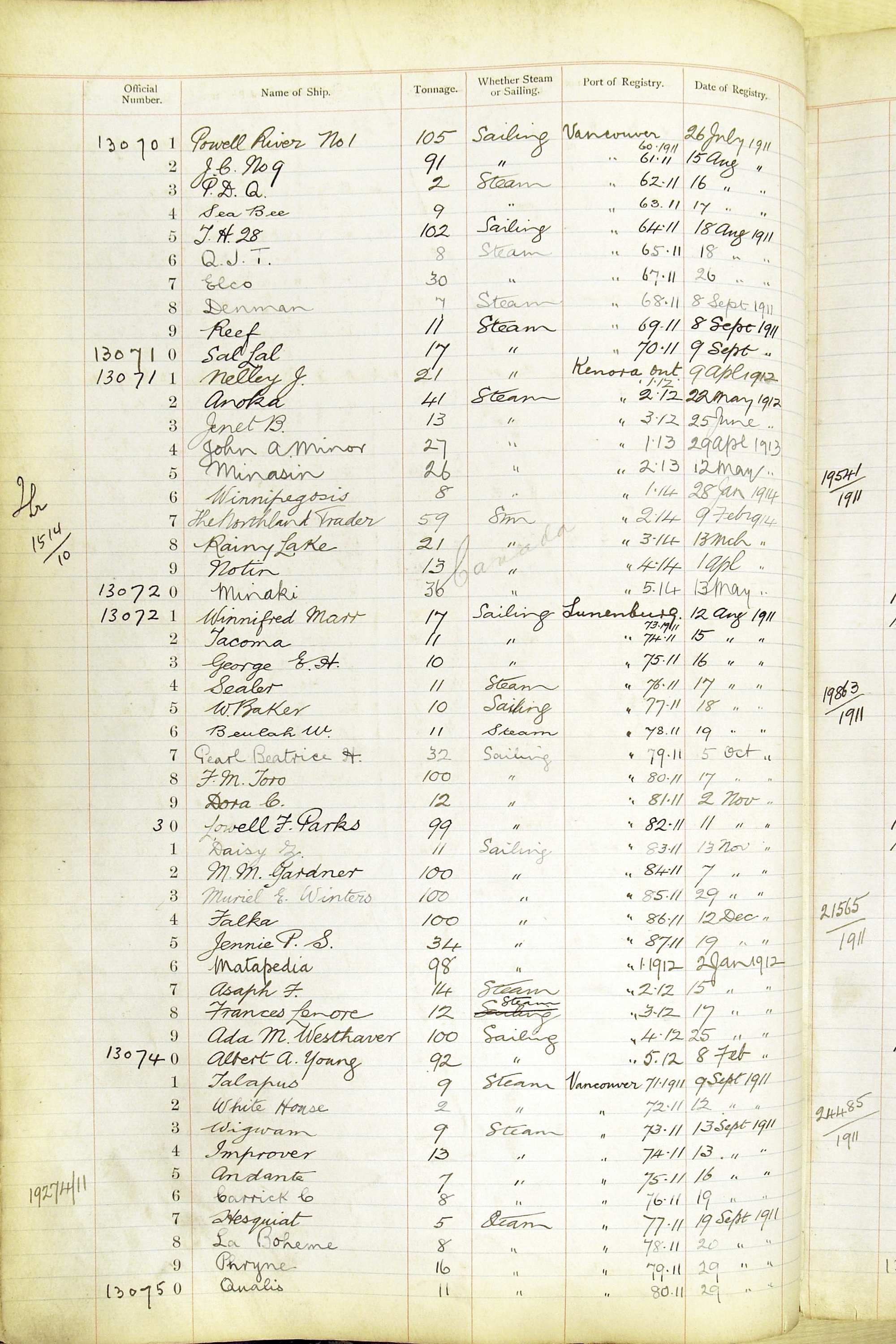 When the system of official numbers began on 16 April 1855, the British Ports of Registry were each allocated batches of official numbers. For official numbers up to 22200 you can see this allocation as a pencil note at the top of the page where the allocation began. A summary of the first allocation is shown here: Initial allocation of official numbers