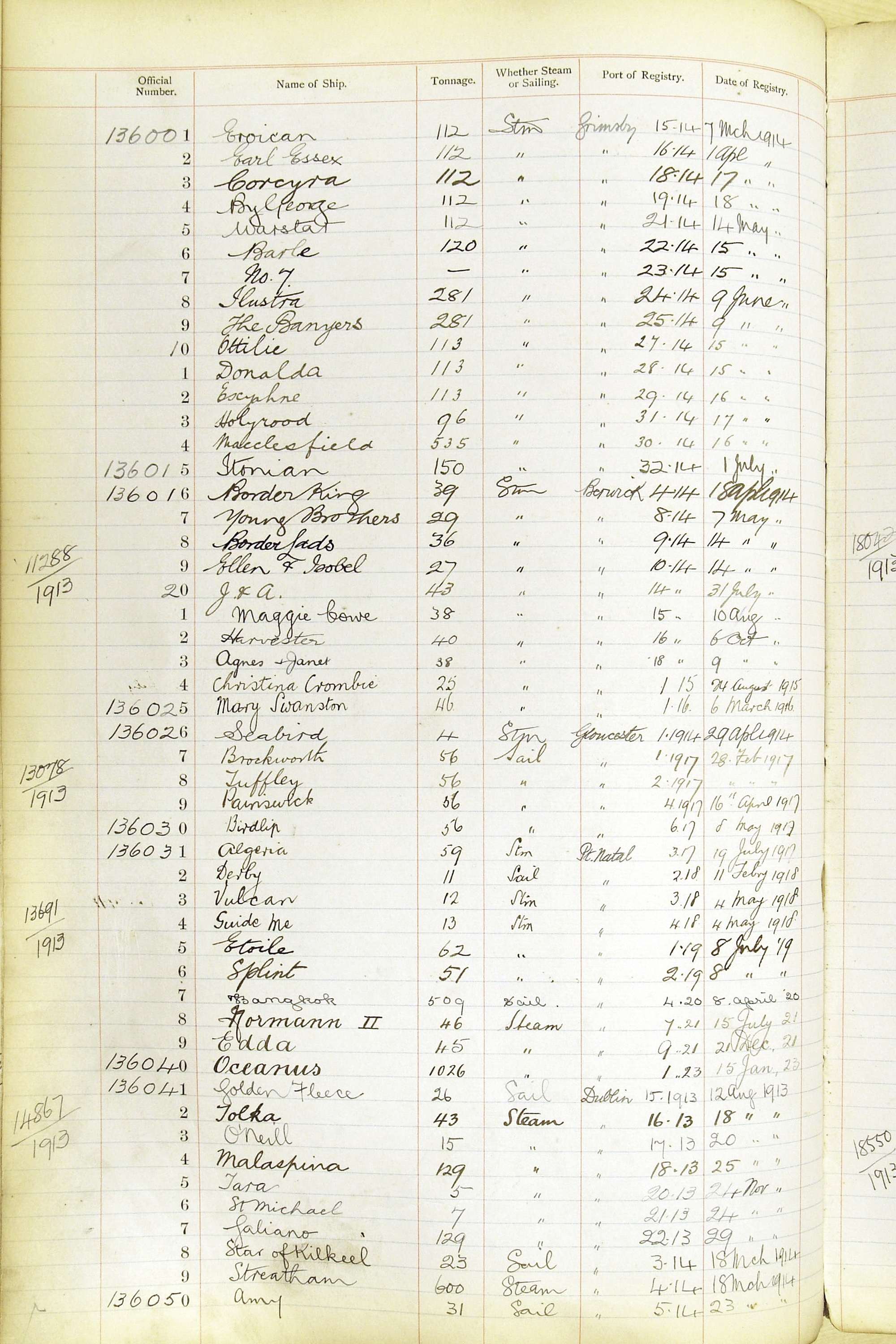 When the system of official numbers began on 16 April 1855, the British Ports of Registry were each allocated batches of official numbers. For official numbers up to 22200 you can see this allocation as a pencil note at the top of the page where the allocation began. A summary of the first allocation is shown here: Initial allocation of official numbers