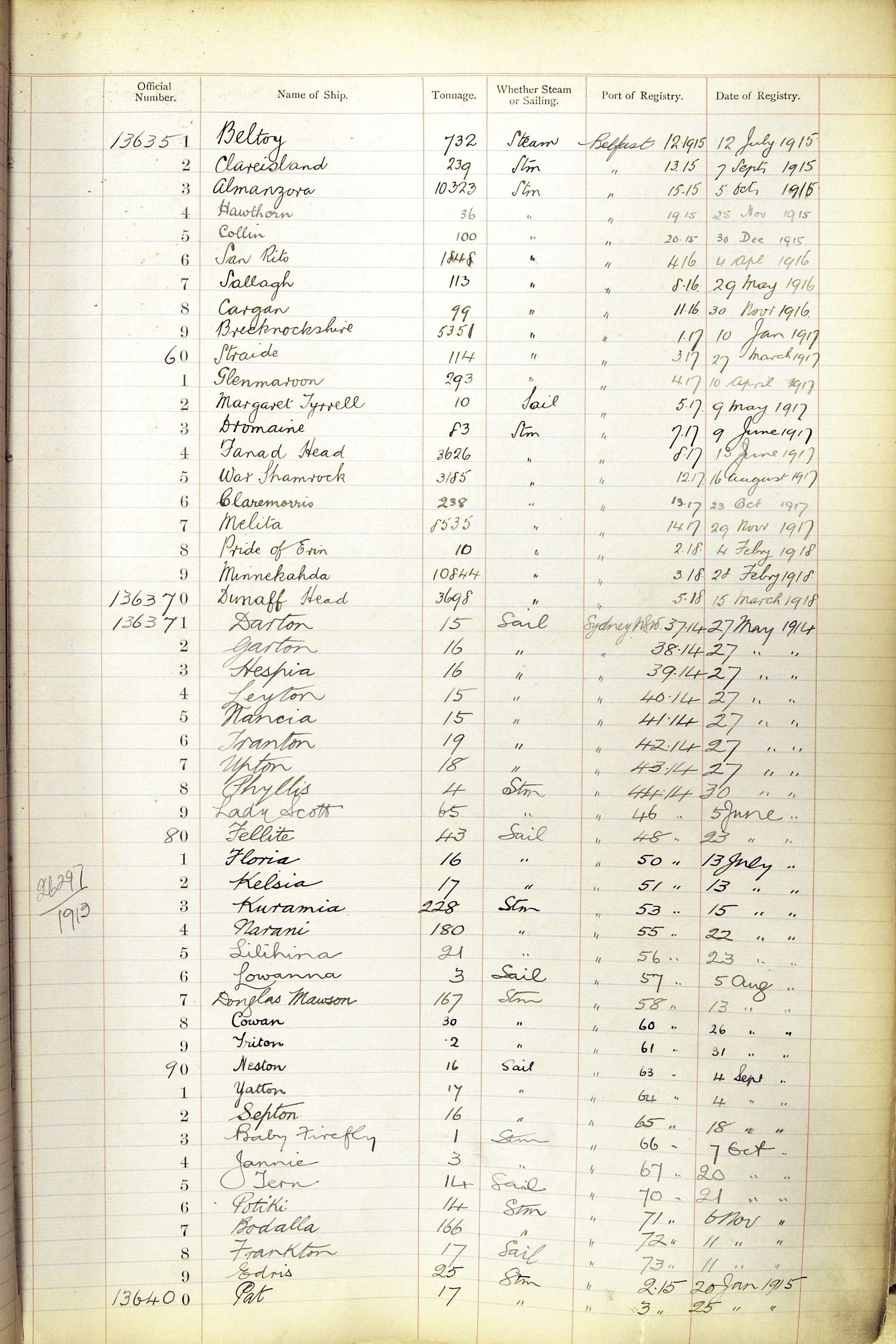 When the system of official numbers began on 16 April 1855, the British Ports of Registry were each allocated batches of official numbers. For official numbers up to 22200 you can see this allocation as a pencil note at the top of the page where the allocation began. A summary of the first allocation is shown here: Initial allocation of official numbers