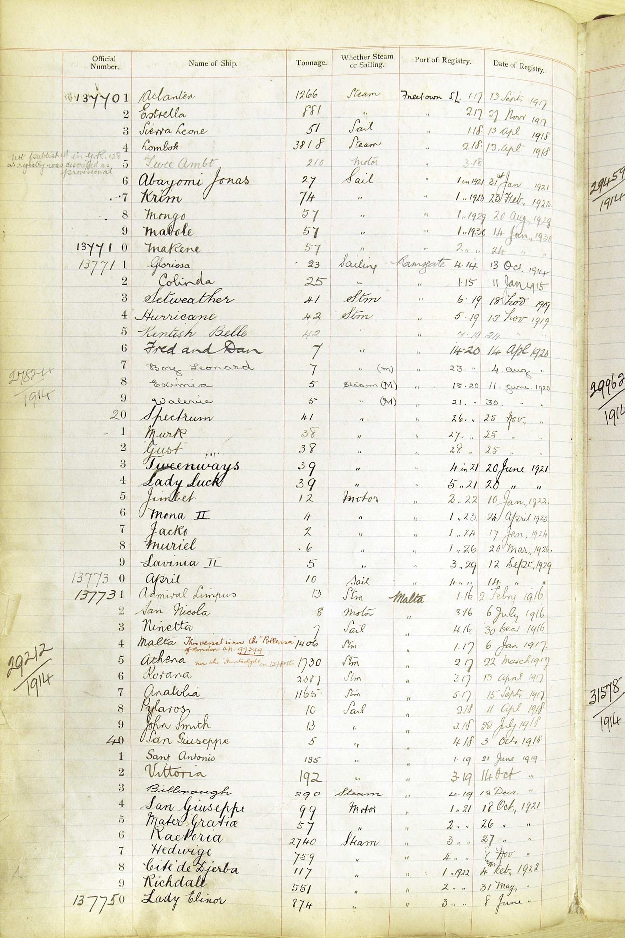 When the system of official numbers began on 16 April 1855, the British Ports of Registry were each allocated batches of official numbers. For official numbers up to 22200 you can see this allocation as a pencil note at the top of the page where the allocation began. A summary of the first allocation is shown here: Initial allocation of official numbers