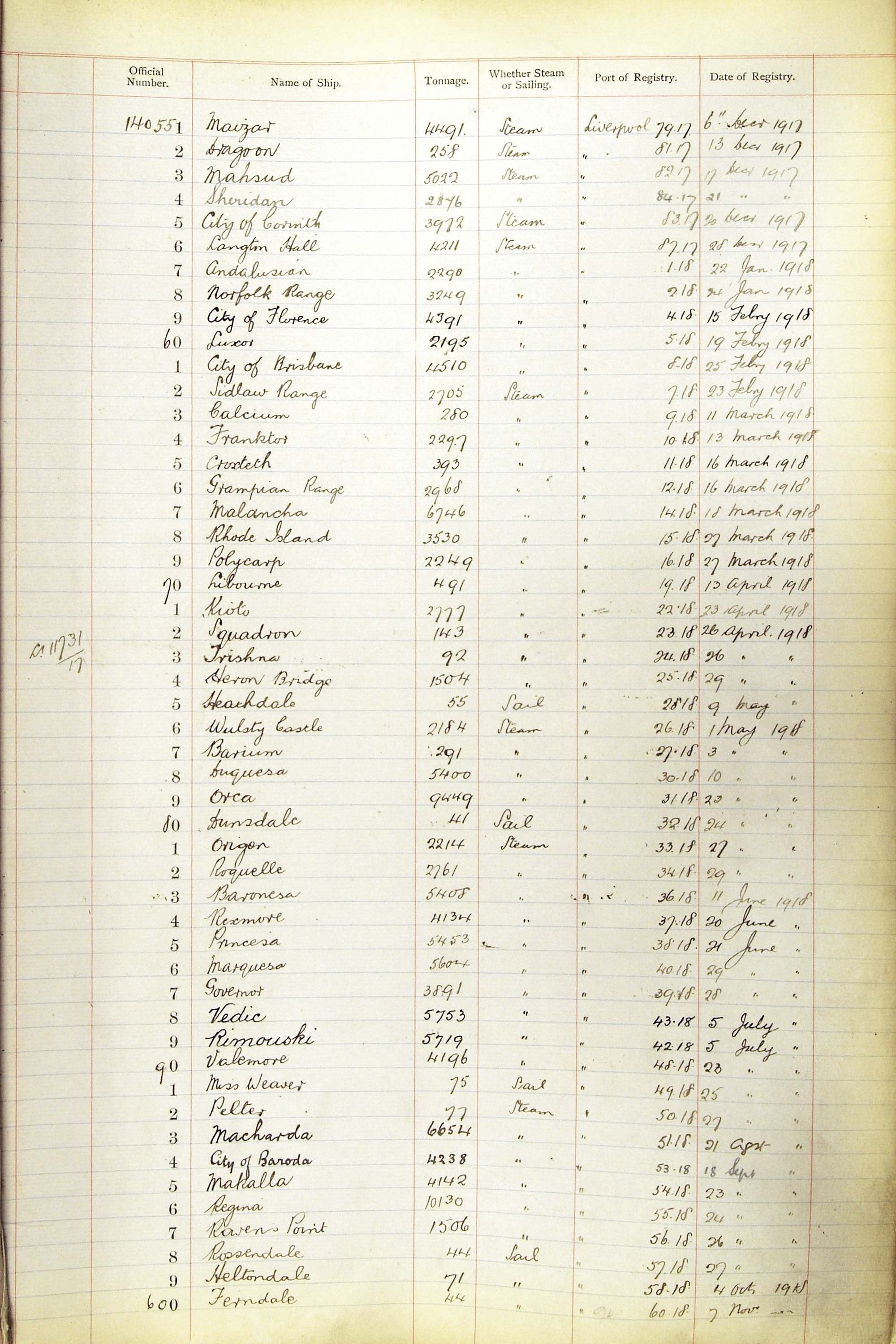 When the system of official numbers began on 16 April 1855, the British Ports of Registry were each allocated batches of official numbers. For official numbers up to 22200 you can see this allocation as a pencil note at the top of the page where the allocation began. A summary of the first allocation is shown here: Initial allocation of official numbers