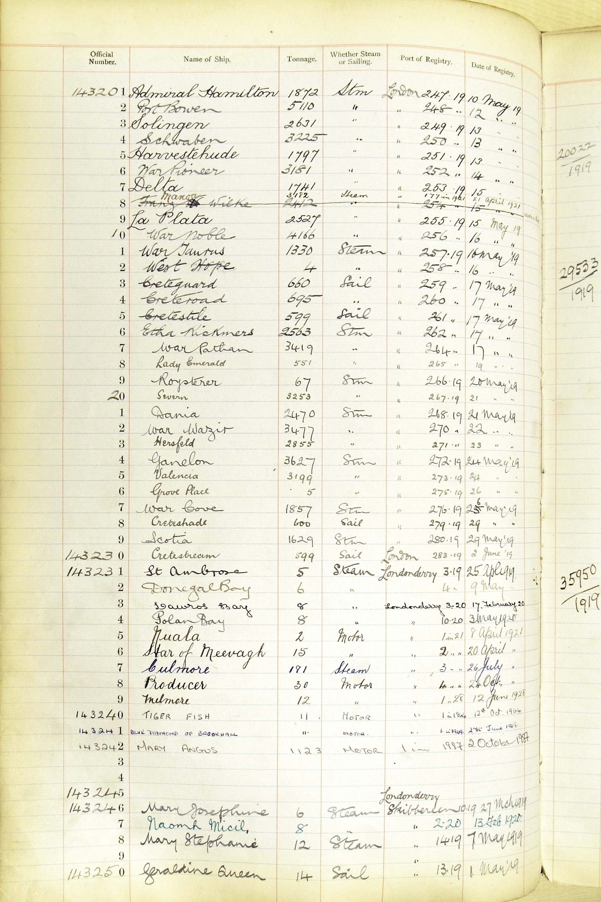 When the system of official numbers began on 16 April 1855, the British Ports of Registry were each allocated batches of official numbers. For official numbers up to 22200 you can see this allocation as a pencil note at the top of the page where the allocation began. A summary of the first allocation is shown here: Initial allocation of official numbers