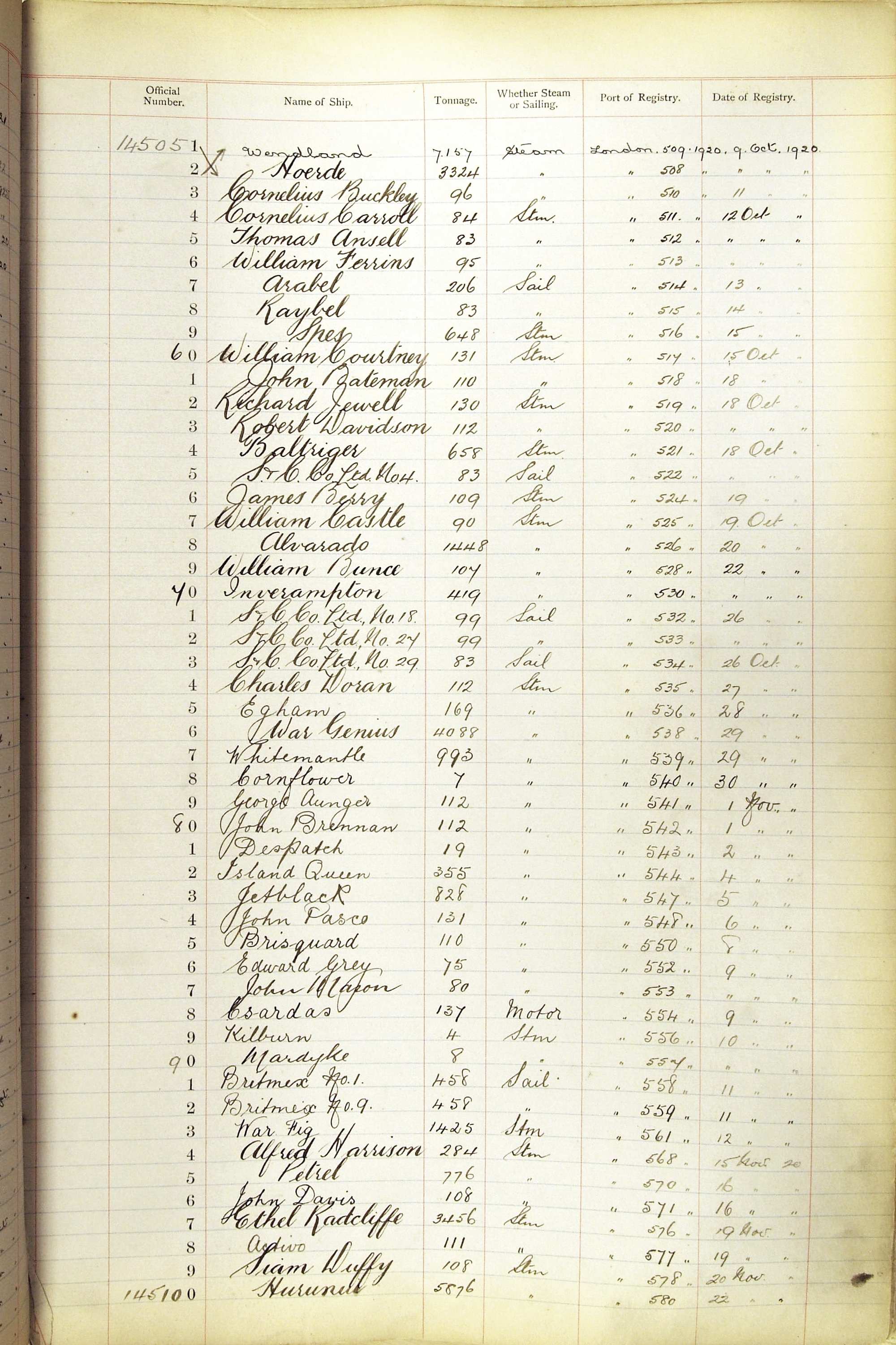 When the system of official numbers began on 16 April 1855, the British Ports of Registry were each allocated batches of official numbers. For official numbers up to 22200 you can see this allocation as a pencil note at the top of the page where the allocation began. A summary of the first allocation is shown here: Initial allocation of official numbers