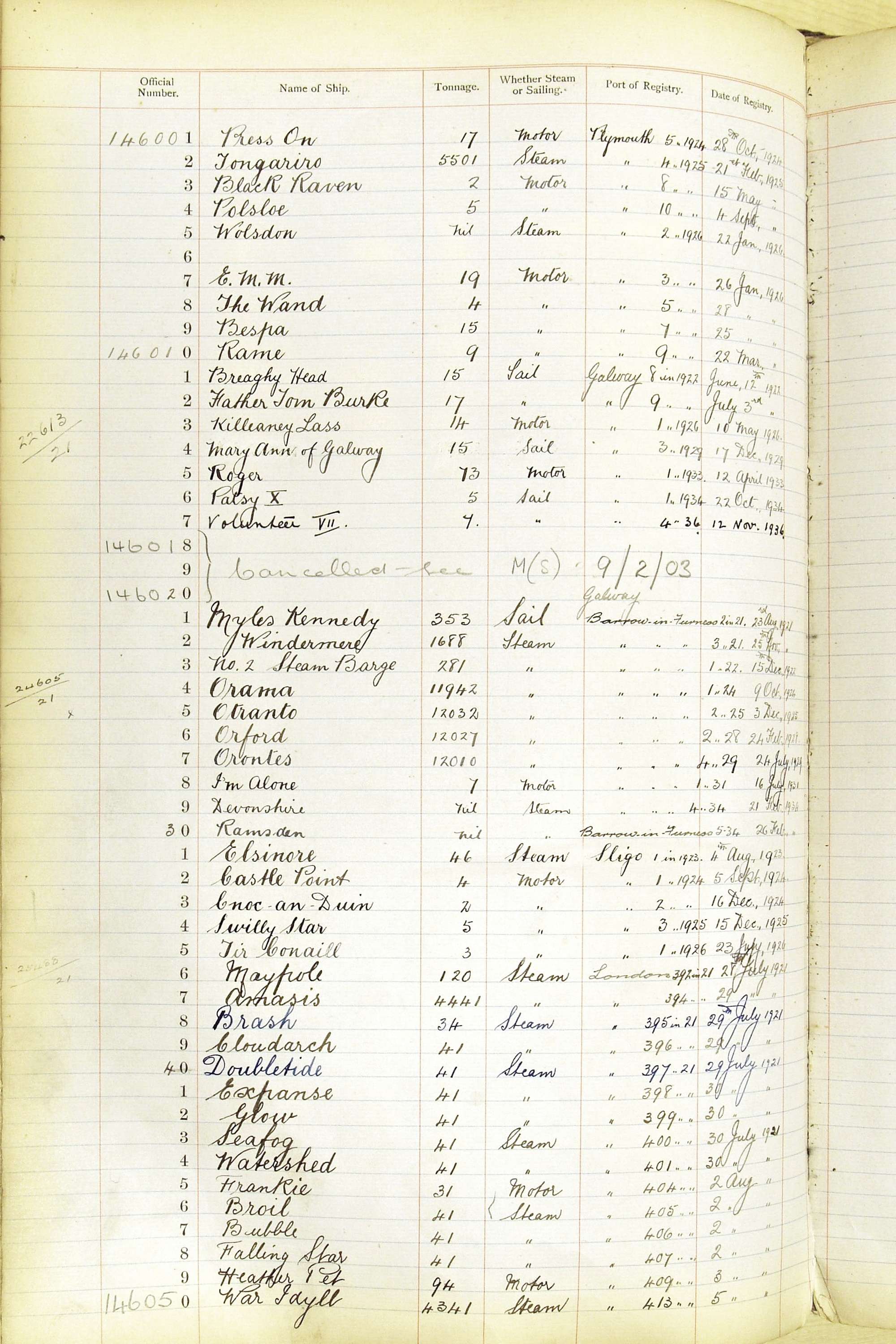 When the system of official numbers began on 16 April 1855, the British Ports of Registry were each allocated batches of official numbers. For official numbers up to 22200 you can see this allocation as a pencil note at the top of the page where the allocation began. A summary of the first allocation is shown here: Initial allocation of official numbers