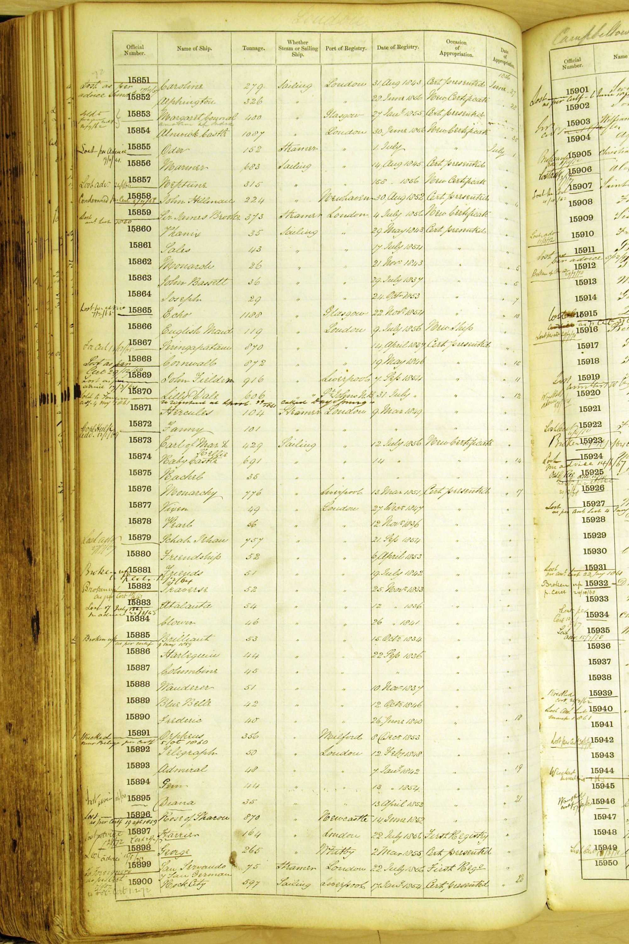 Especially in the first volume, there are frequent margin annotations against the entries which (if you can decipher them) can provide information on the ultimate fate of the ship. Typical entries are 'Lost as per cert[ificate] 20/6/58' or 'Sold foreigners per advice 8/4/67'. Beware - it is sometimes not easy to see which entry it refers to. However, these annotations may be a useful quick alternative to consulting the original Shipping Registers.