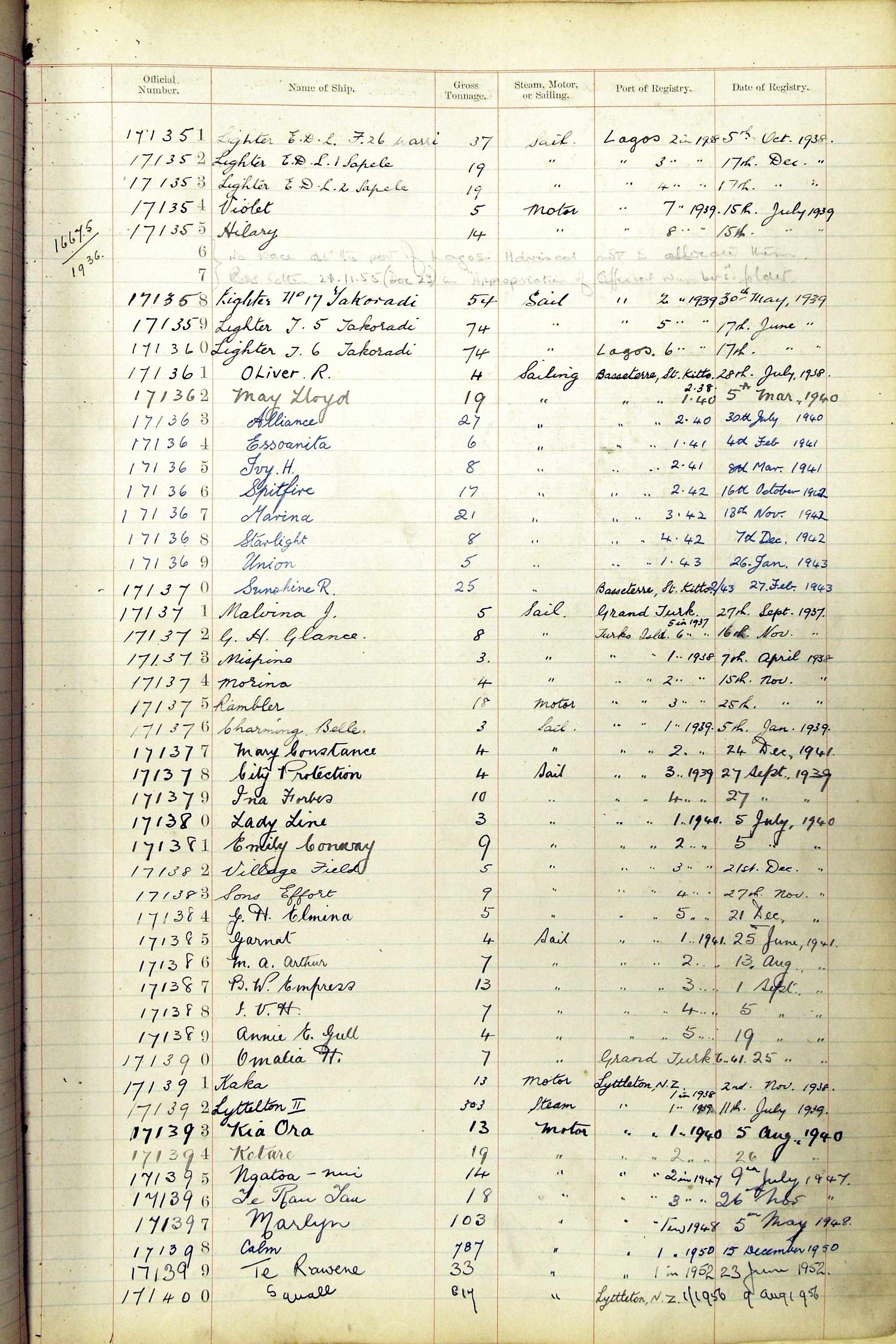 When the system of official numbers began on 16 April 1855, the British Ports of Registry were each allocated batches of official numbers. For official numbers up to 22200 you can see this allocation as a pencil note at the top of the page where the allocation began. A summary of the first allocation is shown here: Initial allocation of official numbers