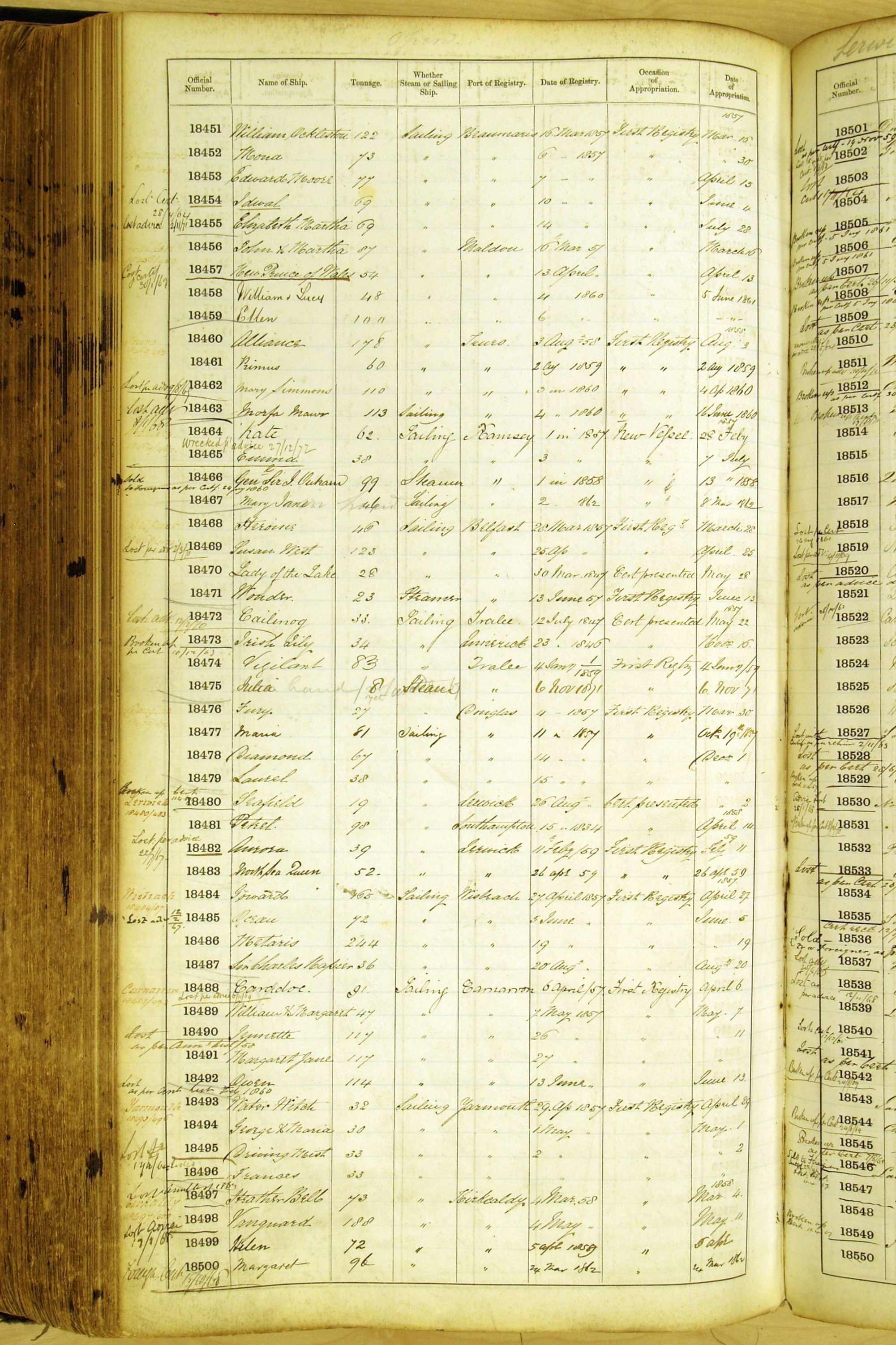 Especially in the first volume, there are frequent margin annotations against the entries which (if you can decipher them) can provide information on the ultimate fate of the ship. Typical entries are 'Lost as per cert[ificate] 20/6/58' or 'Sold foreigners per advice 8/4/67'. Beware - it is sometimes not easy to see which entry it refers to. However, these annotations may be a useful quick alternative to consulting the original Shipping Registers.