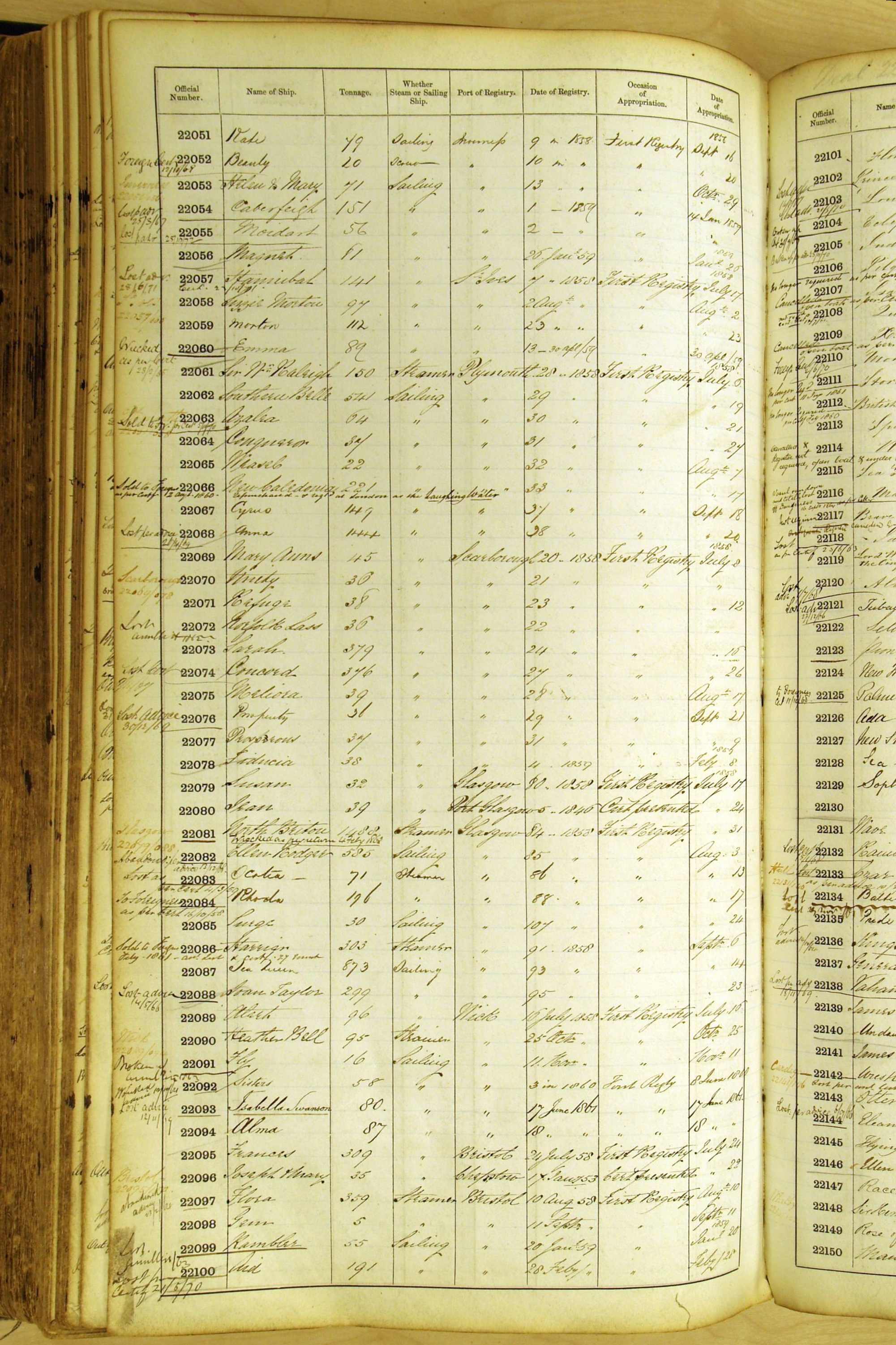 Especially in the first volume, there are frequent margin annotations against the entries which (if you can decipher them) can provide information on the ultimate fate of the ship. Typical entries are 'Lost as per cert[ificate] 20/6/58' or 'Sold foreigners per advice 8/4/67'. Beware - it is sometimes not easy to see which entry it refers to. However, these annotations may be a useful quick alternative to consulting the original Shipping Registers.
