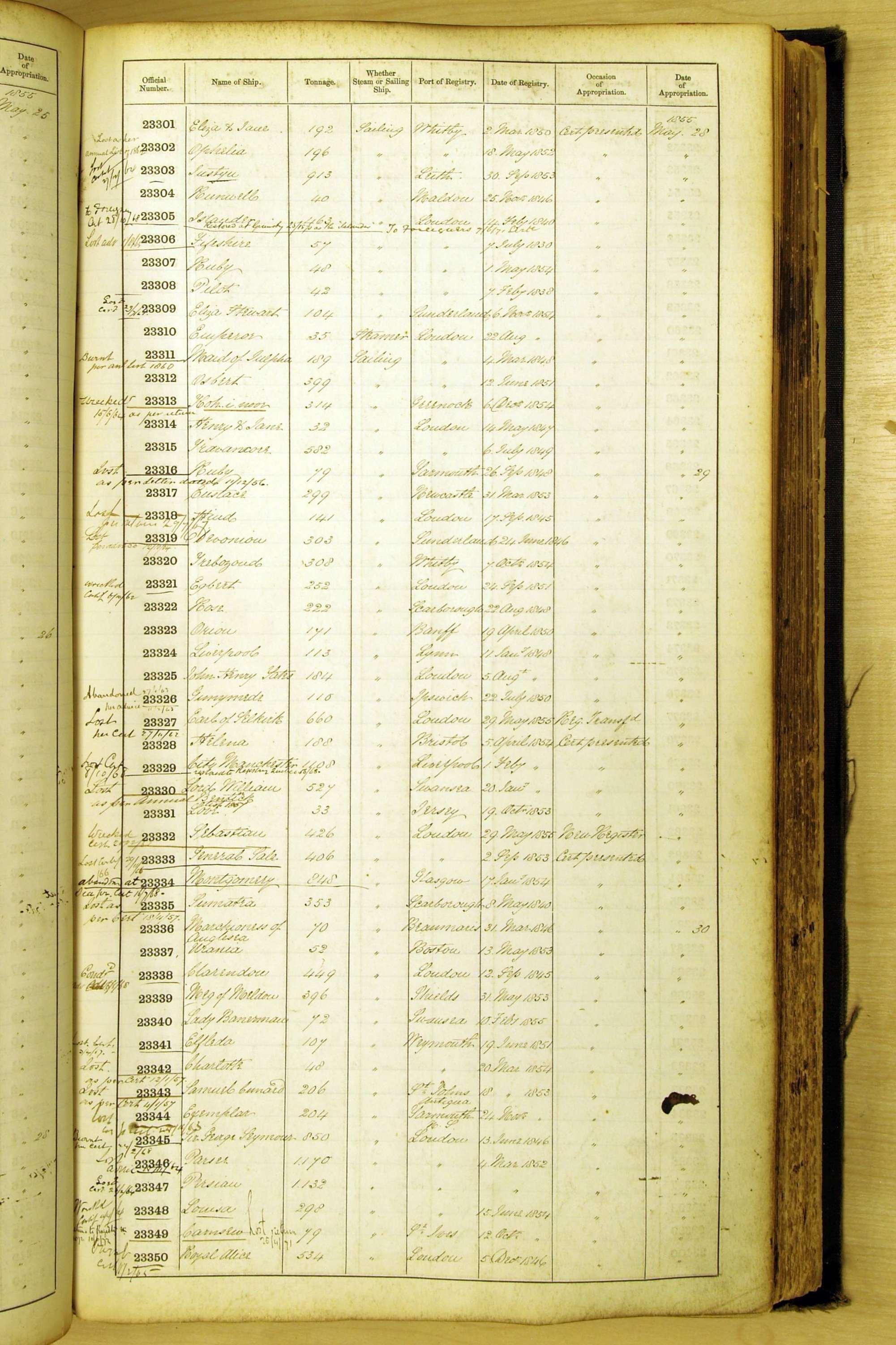 Especially in the first volume, there are frequent margin annotations against the entries which (if you can decipher them) can provide information on the ultimate fate of the ship. Typical entries are 'Lost as per cert[ificate] 20/6/58' or 'Sold foreigners per advice 8/4/67'. Beware - it is sometimes not easy to see which entry it refers to. However, these annotations may be a useful quick alternative to consulting the original Shipping Registers.