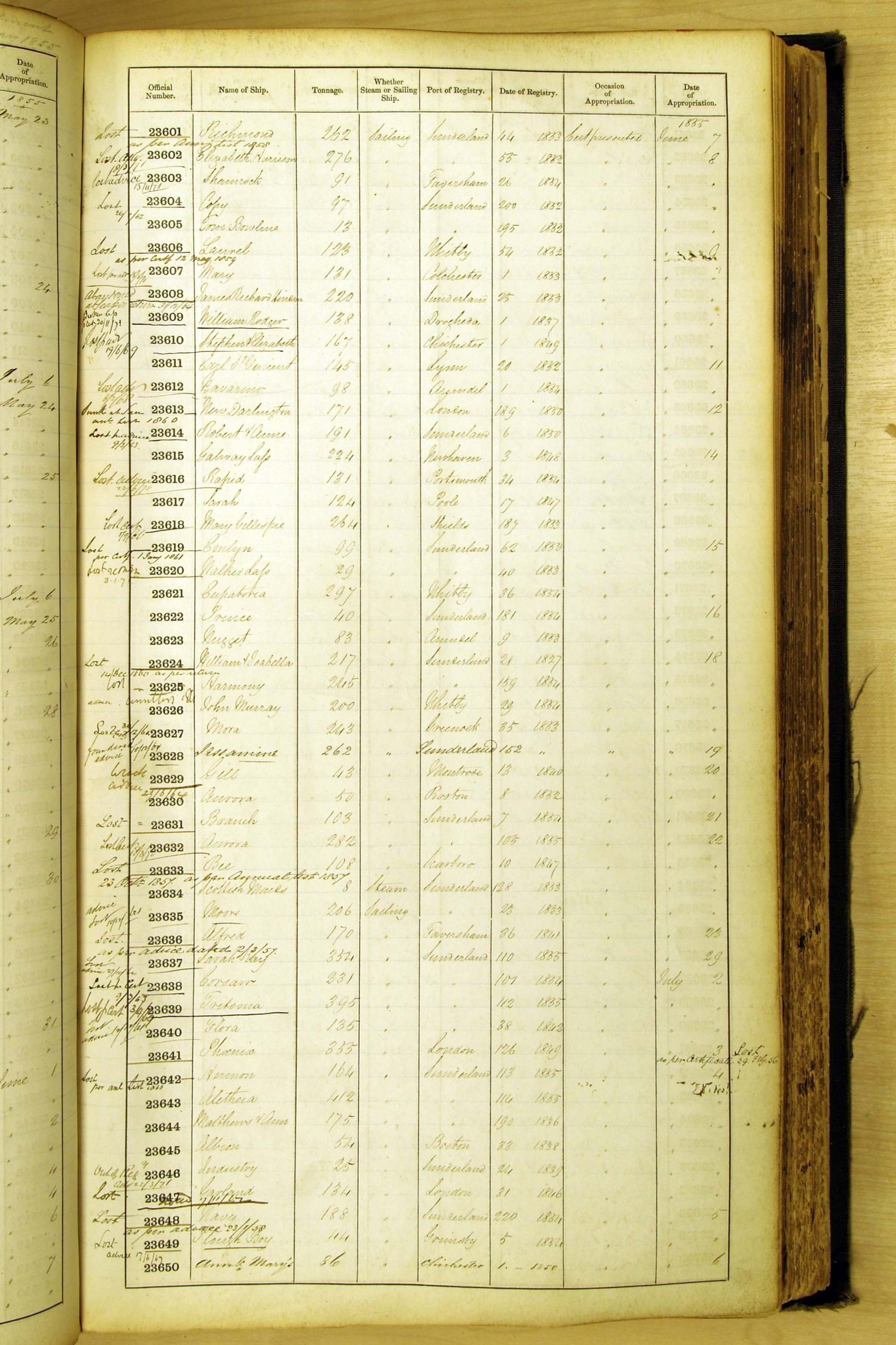 Especially in the first volume, there are frequent margin annotations against the entries which (if you can decipher them) can provide information on the ultimate fate of the ship. Typical entries are 'Lost as per cert[ificate] 20/6/58' or 'Sold foreigners per advice 8/4/67'. Beware - it is sometimes not easy to see which entry it refers to. However, these annotations may be a useful quick alternative to consulting the original Shipping Registers.