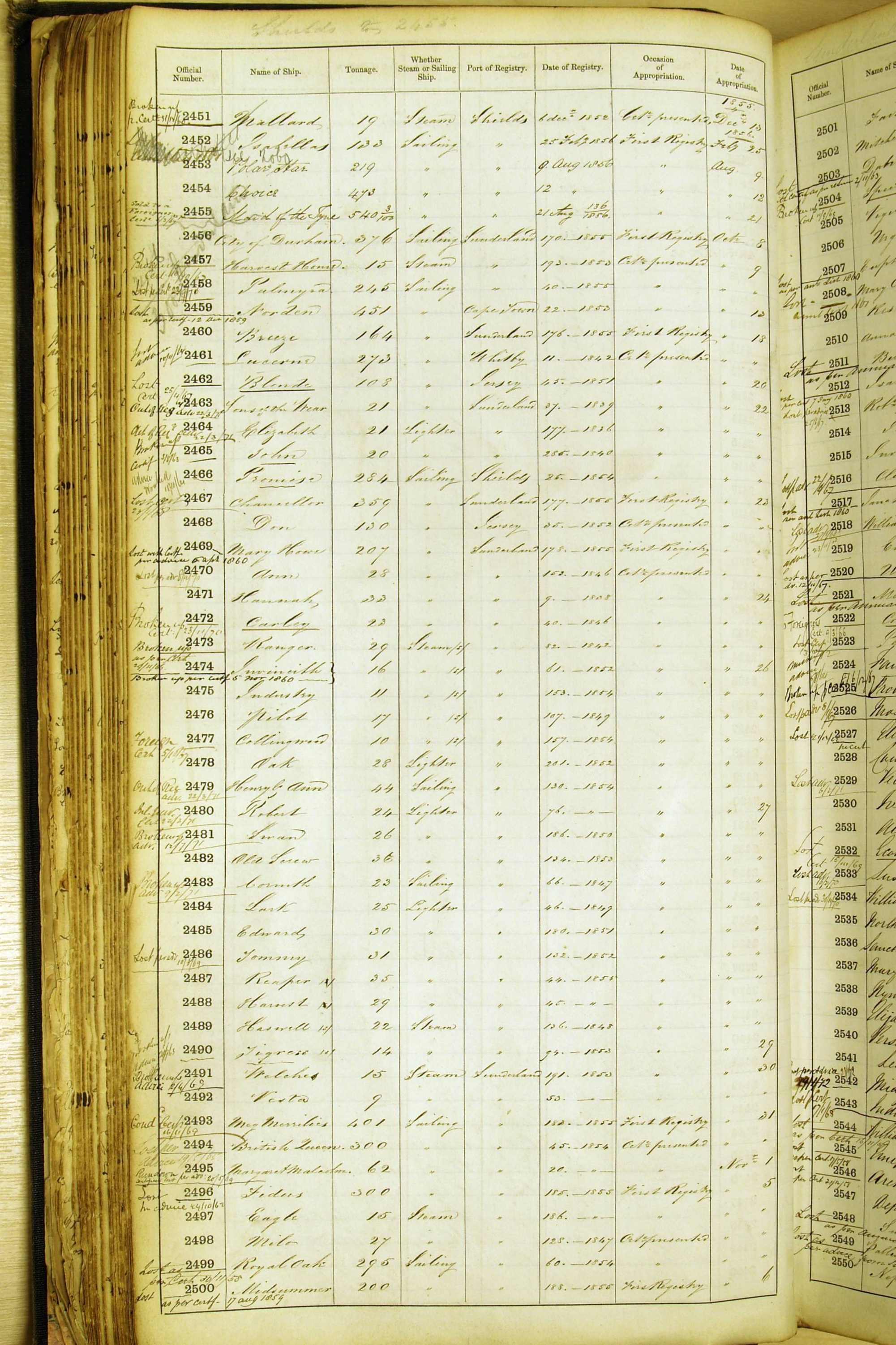 When the system of official numbers began on 16 April 1855, the British Ports of Registry were each allocated batches of official numbers. For official numbers up to 22200 you can see this allocation as a pencil note at the top of the page where the allocation began. A summary of the first allocation is shown here: