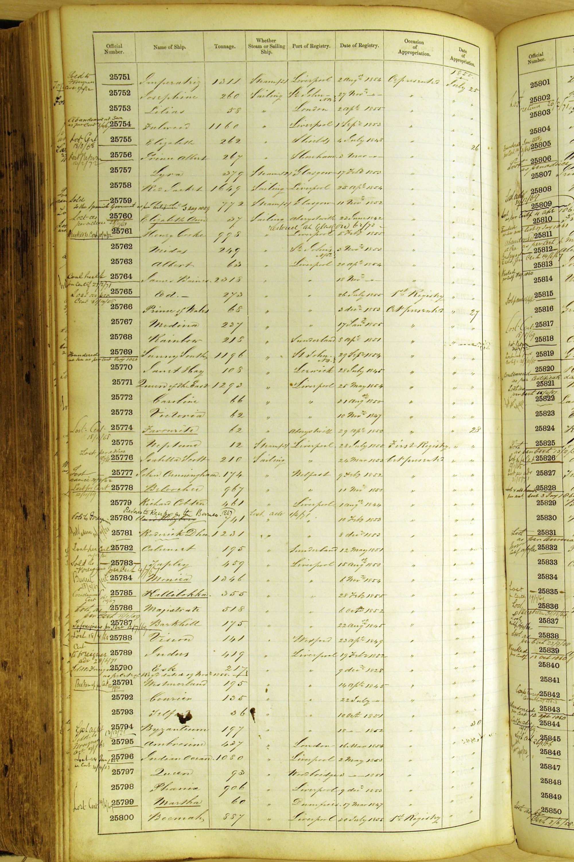 Especially in the first volume, there are frequent margin annotations against the entries which (if you can decipher them) can provide information on the ultimate fate of the ship. Typical entries are 'Lost as per cert[ificate] 20/6/58' or 'Sold foreigners per advice 8/4/67'. Beware - it is sometimes not easy to see which entry it refers to. However, these annotations may be a useful quick alternative to consulting the original Shipping Registers.