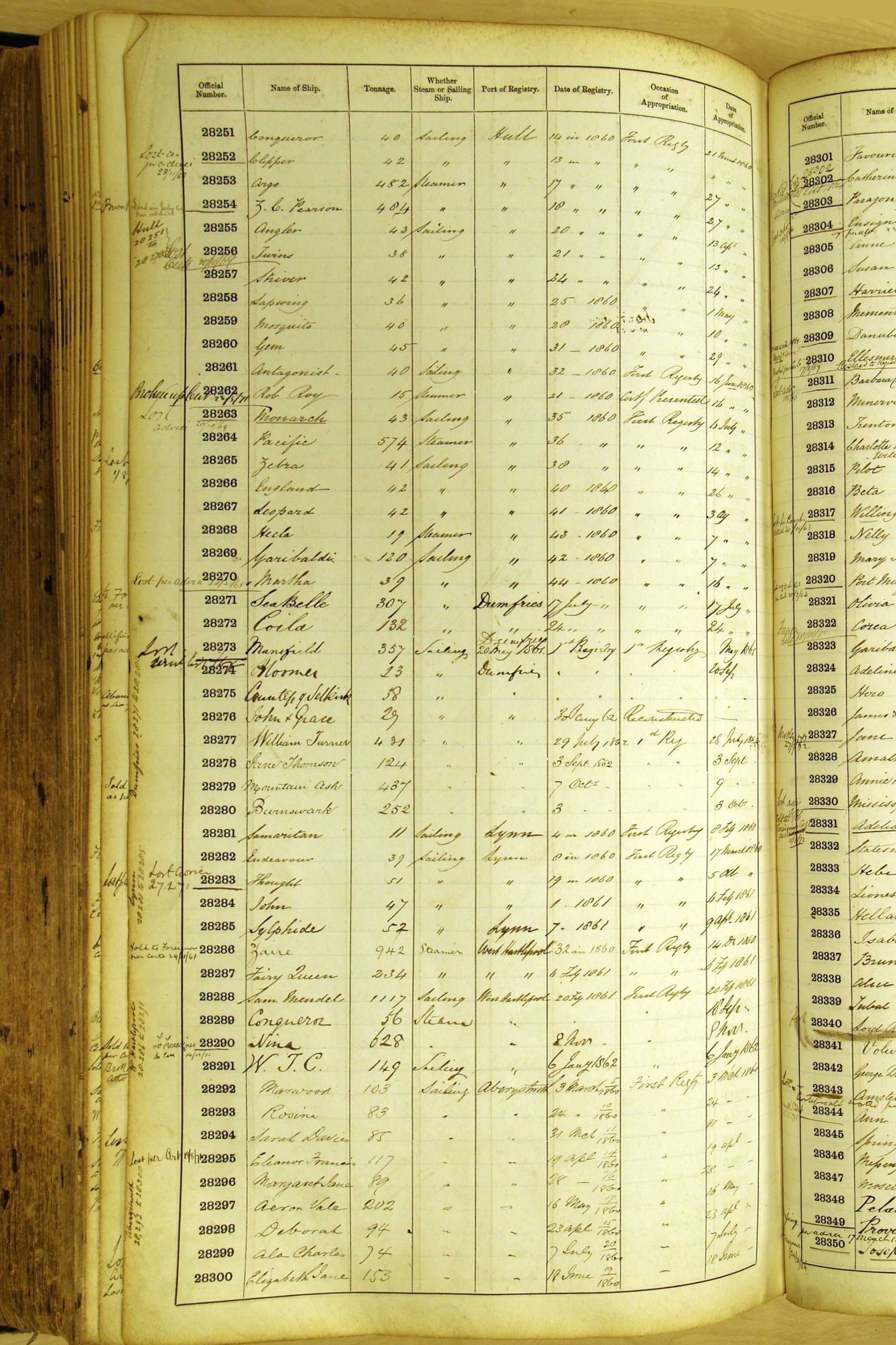 Especially in the first volume, there are frequent margin annotations against the entries which (if you can decipher them) can provide information on the ultimate fate of the ship. Typical entries are 'Lost as per cert[ificate] 20/6/58' or 'Sold foreigners per advice 8/4/67'. Beware - it is sometimes not easy to see which entry it refers to. However, these annotations may be a useful quick alternative to consulting the original Shipping Registers.