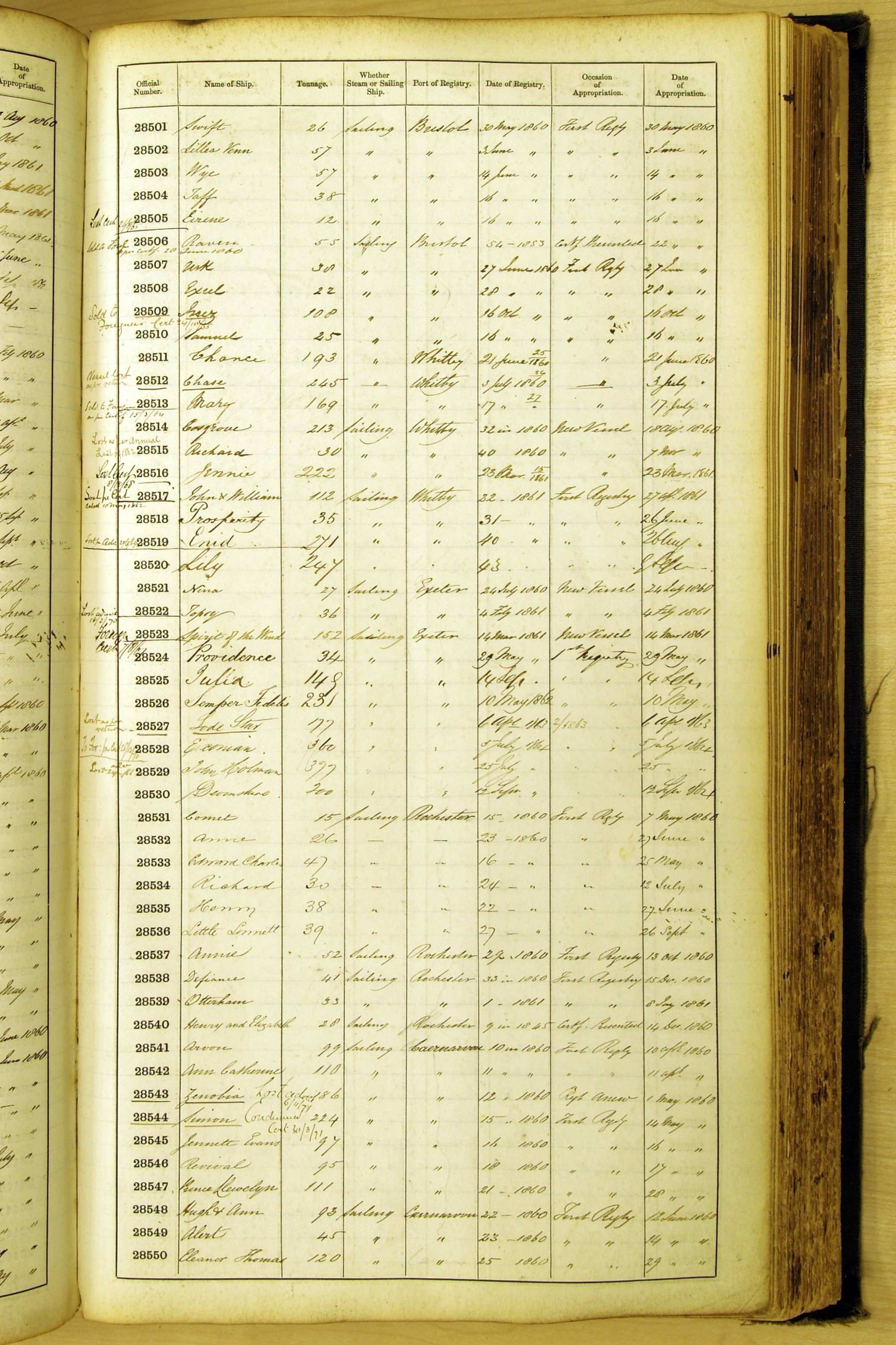Bear in mind that the ships names in the Appropriation Books are not the definitive name or spelling of the name, even though these are the central records for the whole system. As you can see, the entries are hand-written and derived from hand-written returns made by the various ports, themselves based on the hand-written shipping registers, based on what the port officials thought the person registering the ship was saying or had hand-written down.