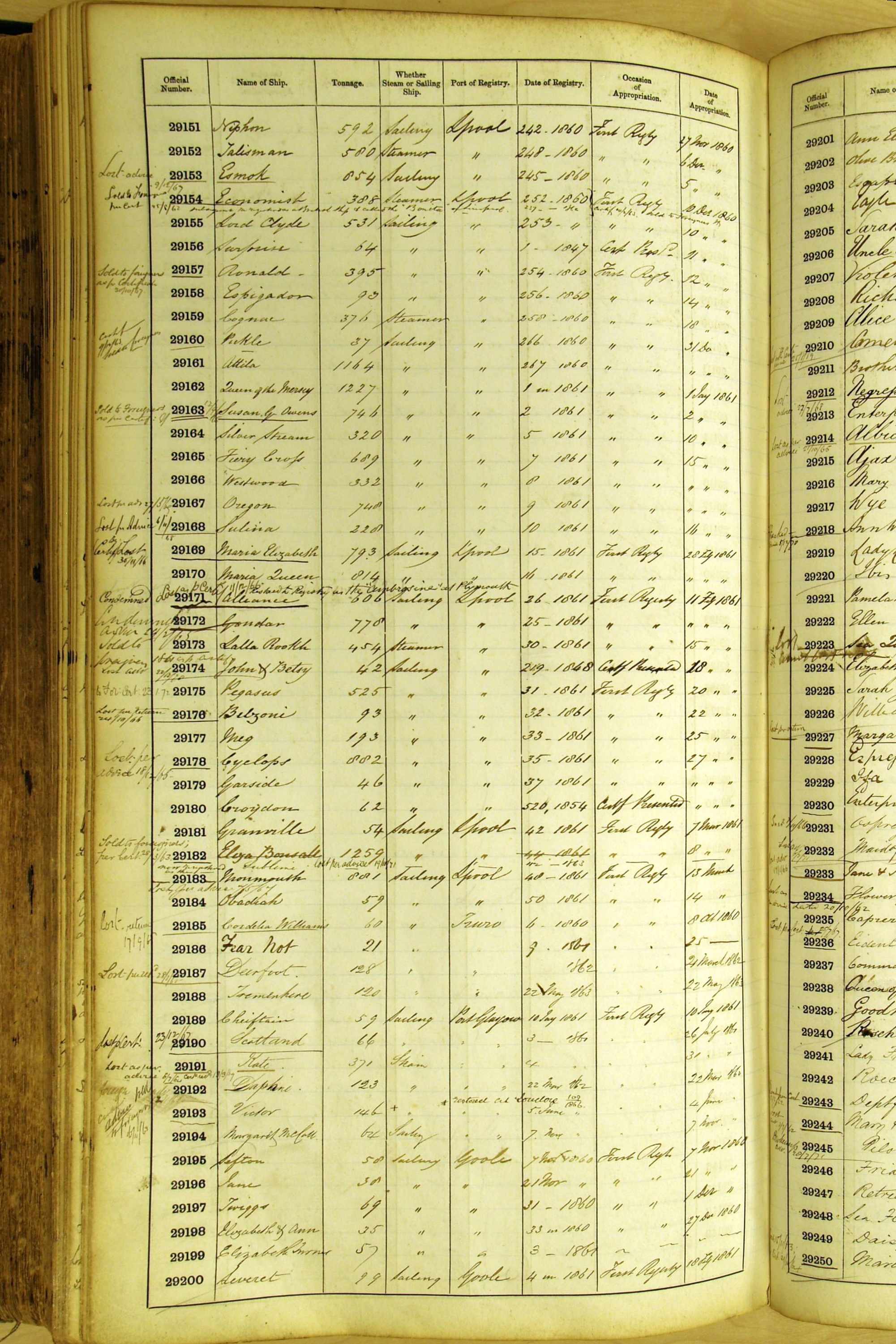Especially in the first volume, there are frequent margin annotations against the entries which (if you can decipher them) can provide information on the ultimate fate of the ship. Typical entries are 'Lost as per cert[ificate] 20/6/58' or 'Sold foreigners per advice 8/4/67'. Beware - it is sometimes not easy to see which entry it refers to. However, these annotations may be a useful quick alternative to consulting the original Shipping Registers.