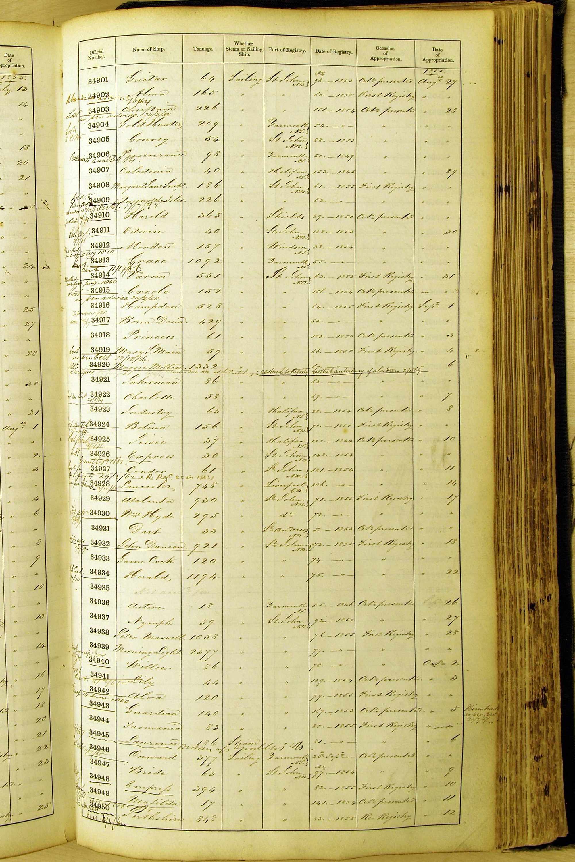 Bear in mind that the ships names in the Appropriation Books are not the definitive name or spelling of the name, even though these are the central records for the whole system. As you can see, the entries are hand-written and derived from hand-written returns made by the various ports, themselves based on the hand-written shipping registers, based on what the port officials thought the person registering the ship was saying or had hand-written down.