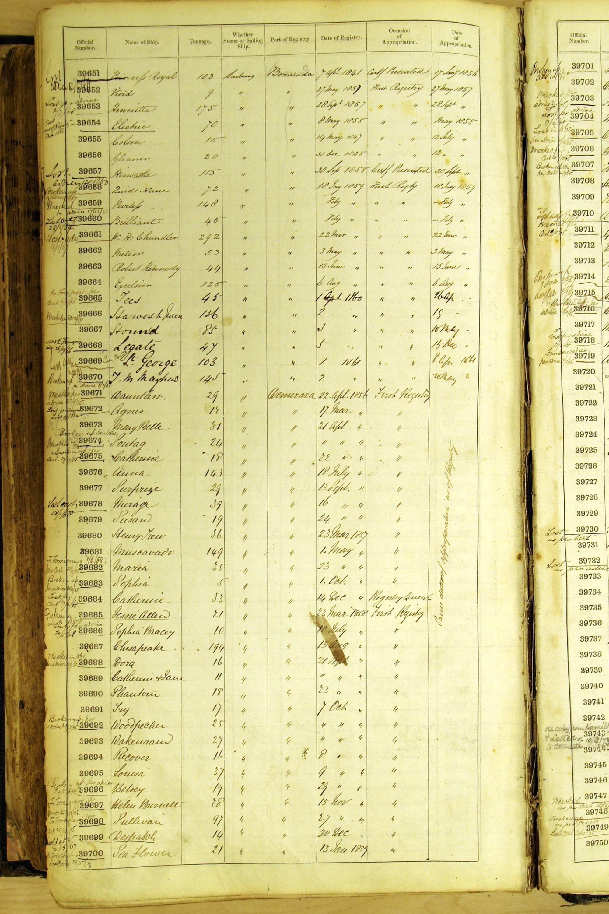 Especially in the first volume, there are frequent margin annotations against the entries which (if you can decipher them) can provide information on the ultimate fate of the ship. Typical entries are 'Lost as per cert[ificate] 20/6/58' or 'Sold foreigners per advice 8/4/67'. Beware - it is sometimes not easy to see which entry it refers to. However, these annotations may be a useful quick alternative to consulting the original Shipping Registers.