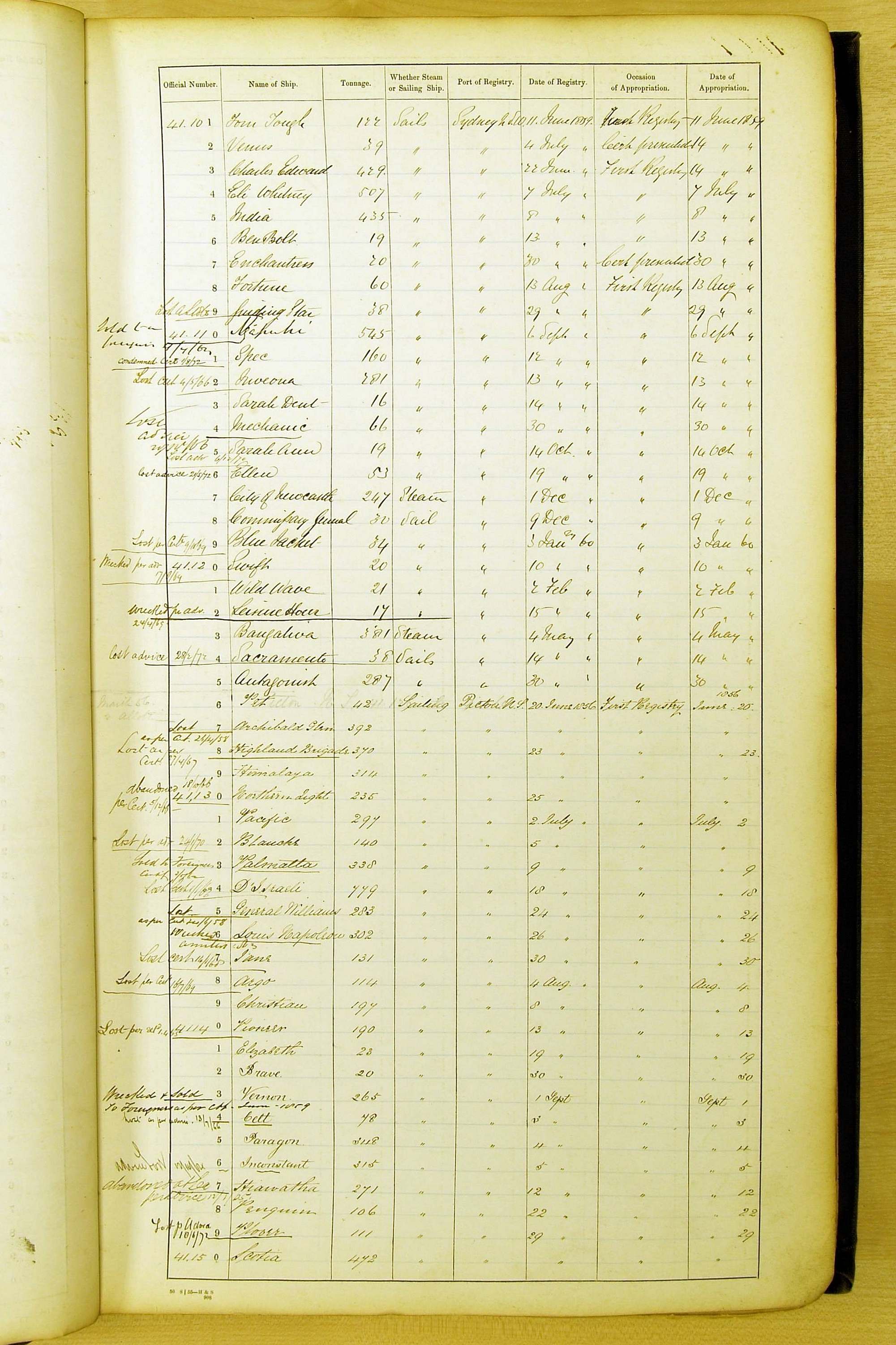 Especially in the first volume, there are frequent margin annotations against the entries which (if you can decipher them) can provide information on the ultimate fate of the ship. Typical entries are 'Lost as per cert[ificate] 20/6/58' or 'Sold foreigners per advice 8/4/67'. Beware - it is sometimes not easy to see which entry it refers to. However, these annotations may be a useful quick alternative to consulting the original Shipping Registers.