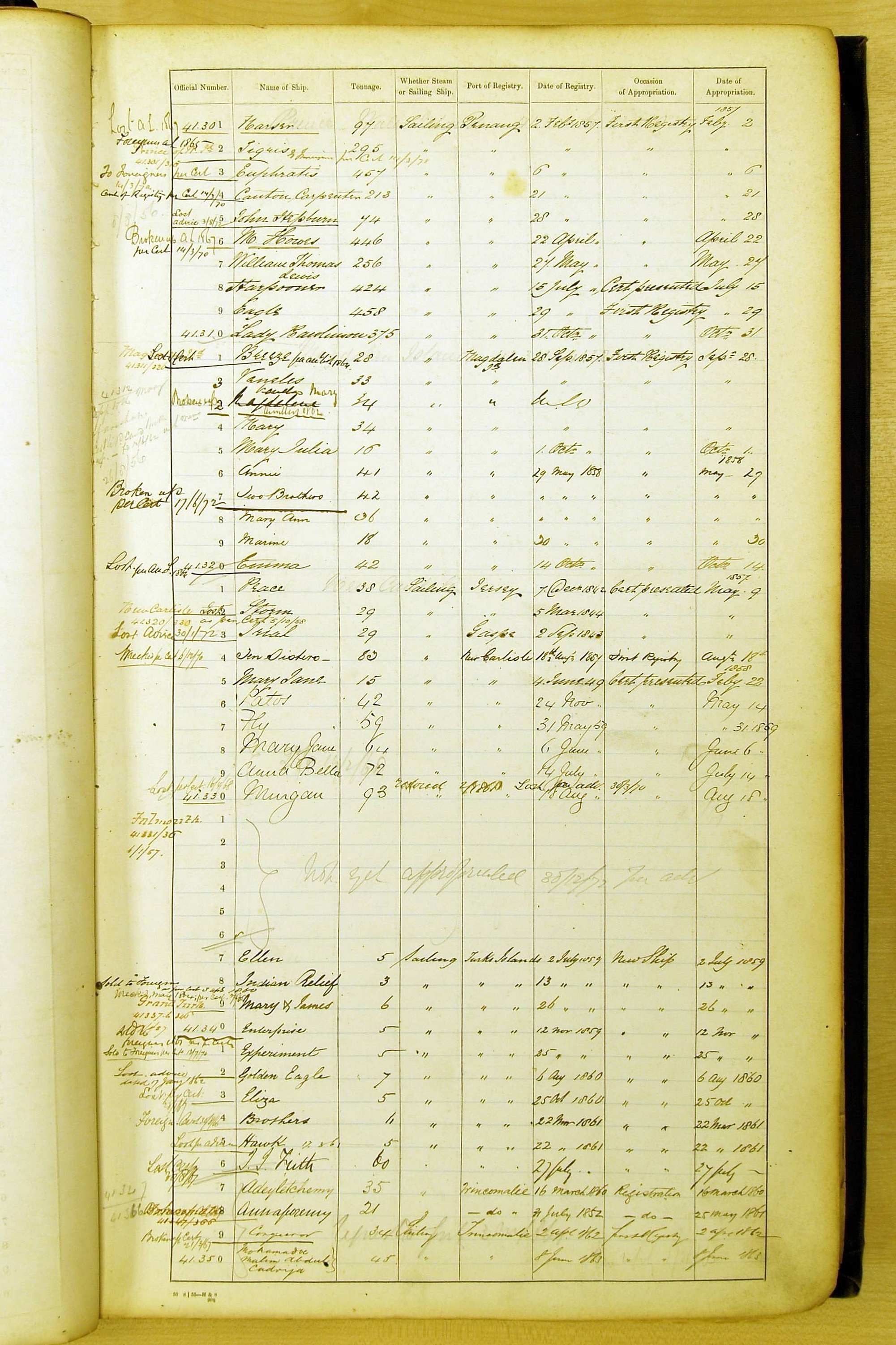 Especially in the first volume, there are frequent margin annotations against the entries which (if you can decipher them) can provide information on the ultimate fate of the ship. Typical entries are 'Lost as per cert[ificate] 20/6/58' or 'Sold foreigners per advice 8/4/67'. Beware - it is sometimes not easy to see which entry it refers to. However, these annotations may be a useful quick alternative to consulting the original Shipping Registers.
