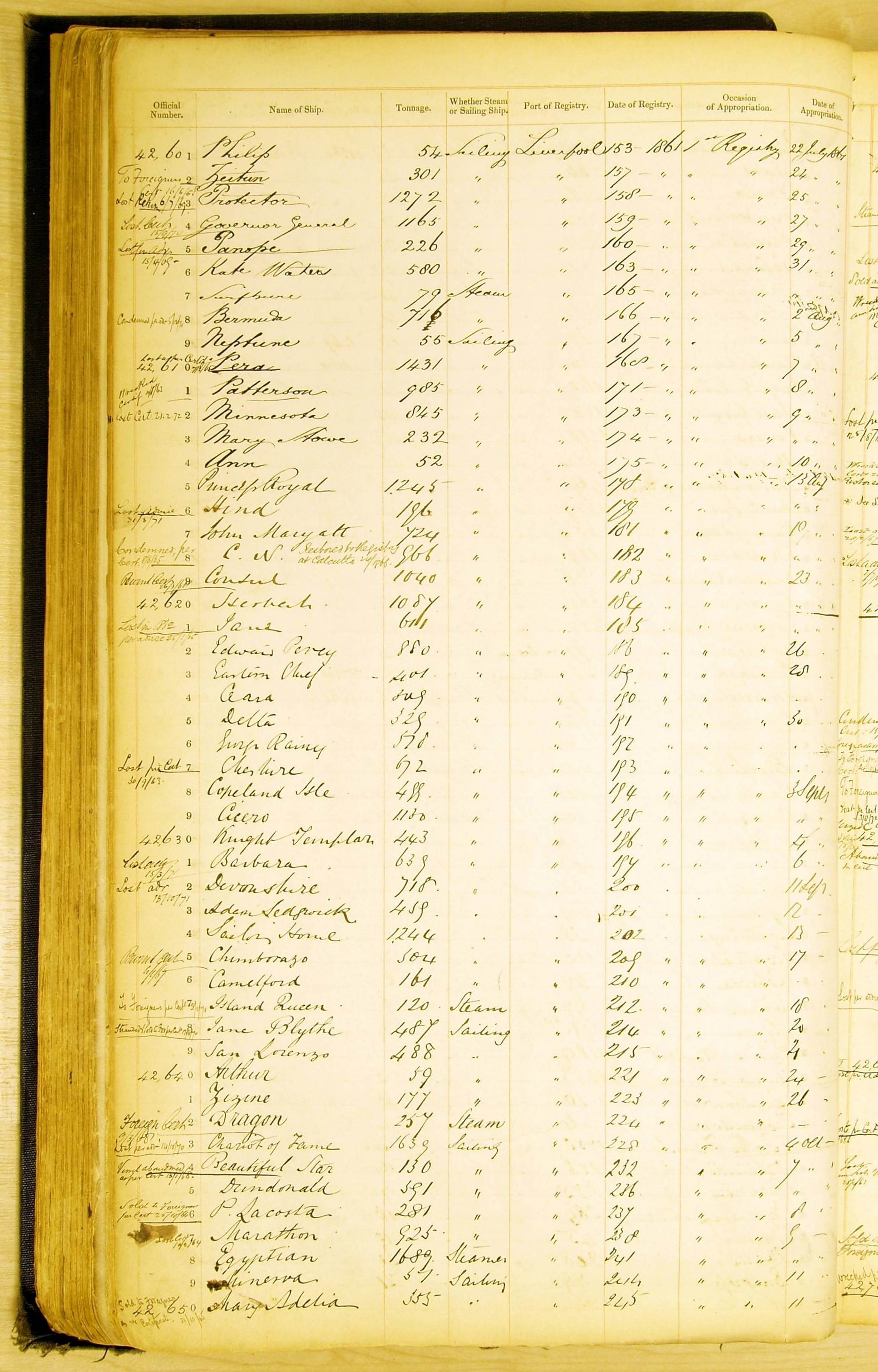 Especially in the first volume, there are frequent margin annotations against the entries which (if you can decipher them) can provide information on the ultimate fate of the ship. Typical entries are 'Lost as per cert[ificate] 20/6/58' or 'Sold foreigners per advice 8/4/67'. Beware - it is sometimes not easy to see which entry it refers to. However, these annotations may be a useful quick alternative to consulting the original Shipping Registers.