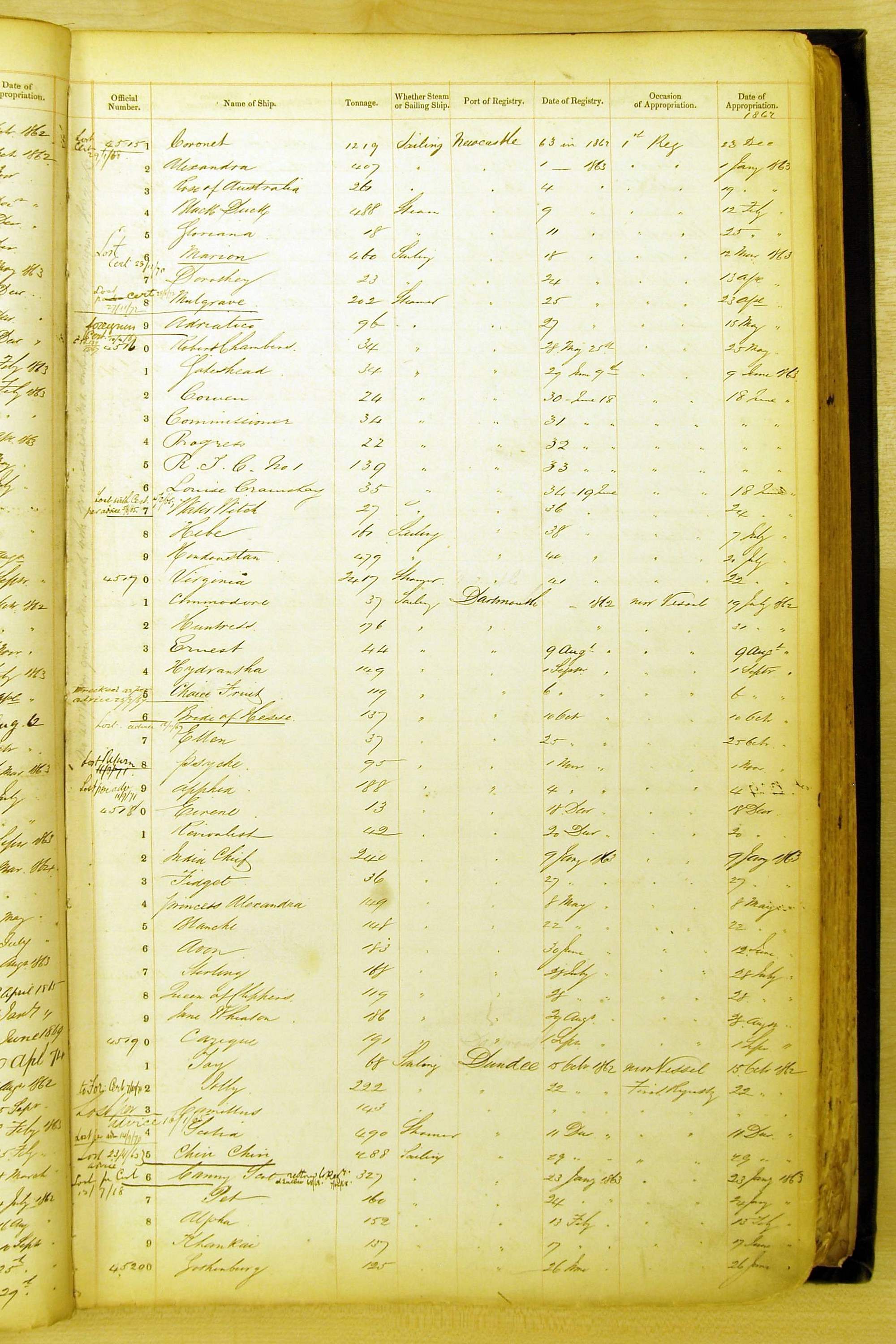 Especially in the first volume, there are frequent margin annotations against the entries which (if you can decipher them) can provide information on the ultimate fate of the ship. Typical entries are 'Lost as per cert[ificate] 20/6/58' or 'Sold foreigners per advice 8/4/67'. Beware - it is sometimes not easy to see which entry it refers to. However, these annotations may be a useful quick alternative to consulting the original Shipping Registers.
