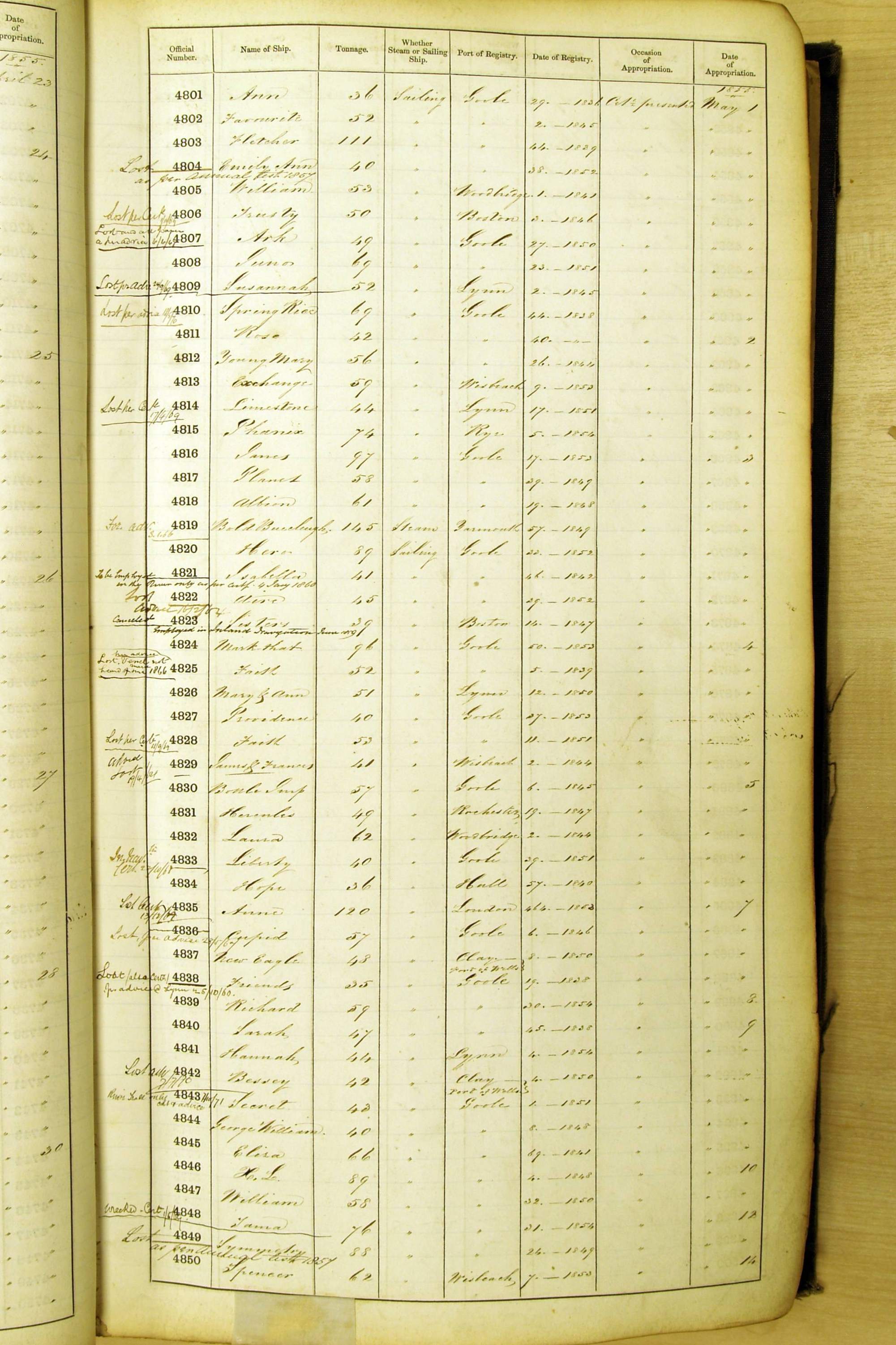 Especially in the first volume, there are frequent margin annotations against the entries which (if you can decipher them) can provide information on the ultimate fate of the ship. Typical entries are 'Lost as per cert[ificate] 20/6/58' or 'Sold foreigners per advice 8/4/67'. Beware - it is sometimes not easy to see which entry it refers to. However, these annotations may be a useful quick alternative to consulting the original Shipping Registers.