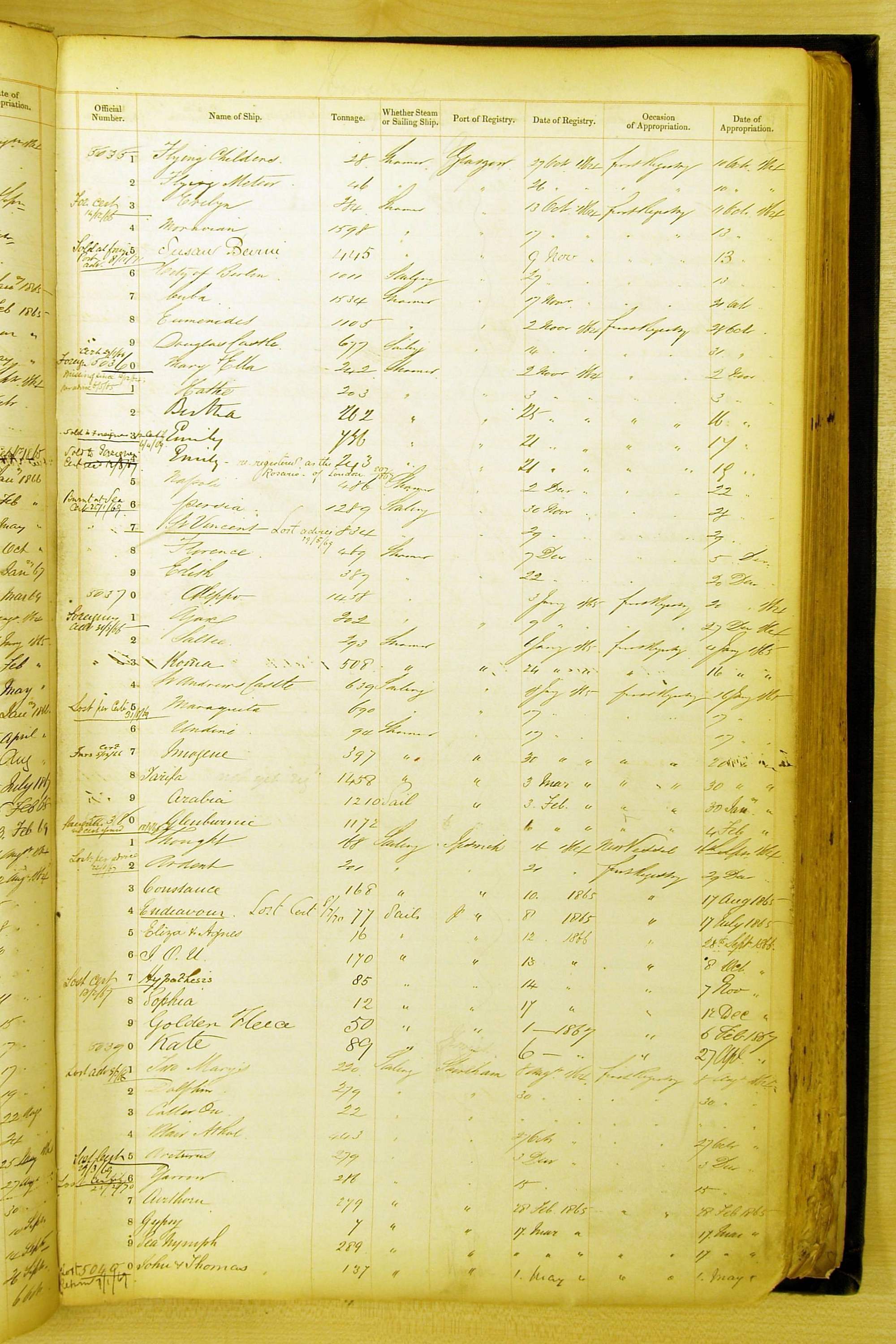 Especially in the first volume, there are frequent margin annotations against the entries which (if you can decipher them) can provide information on the ultimate fate of the ship. Typical entries are 'Lost as per cert[ificate] 20/6/58' or 'Sold foreigners per advice 8/4/67'. Beware - it is sometimes not easy to see which entry it refers to. However, these annotations may be a useful quick alternative to consulting the original Shipping Registers.