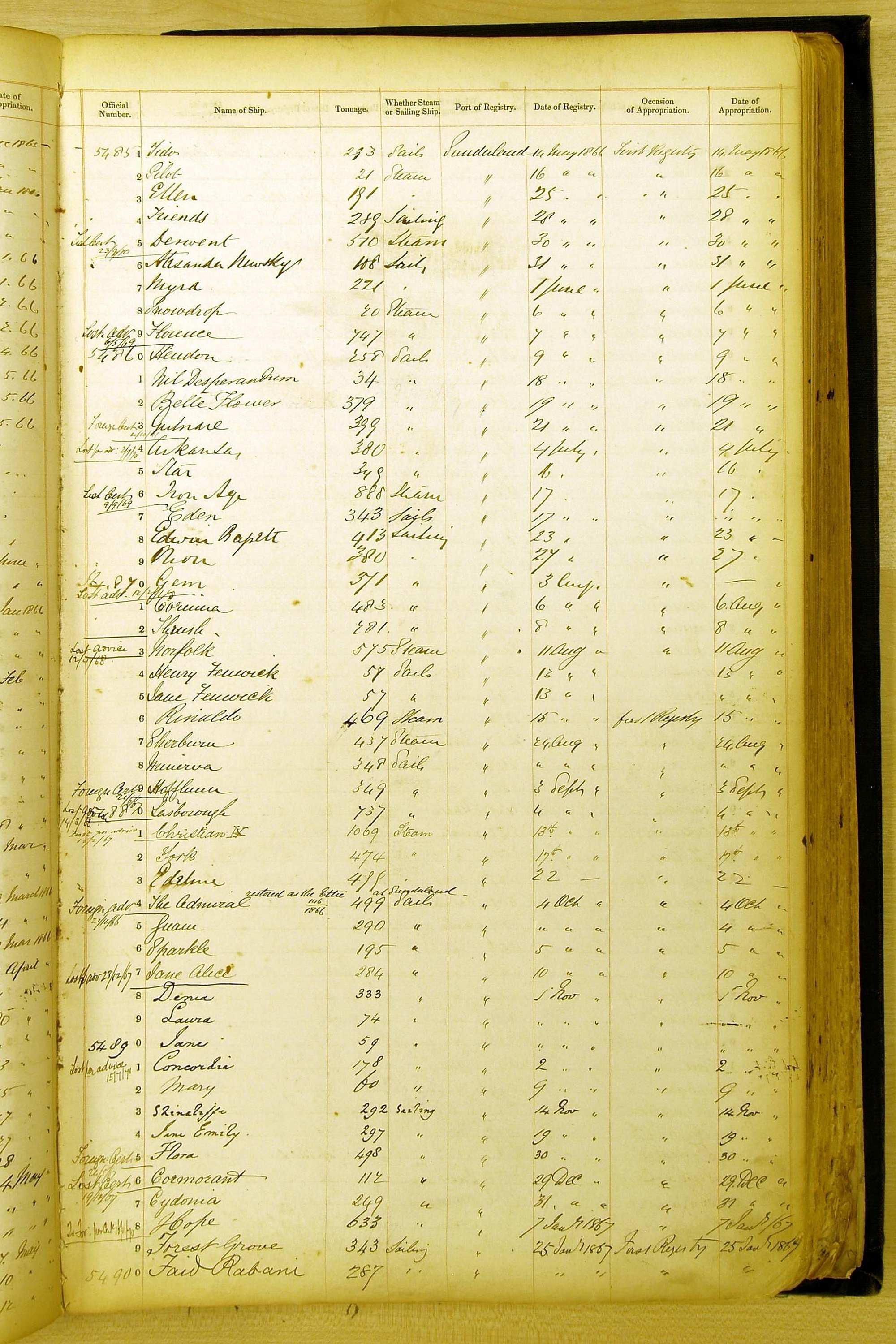 Especially in the first volume, there are frequent margin annotations against the entries which (if you can decipher them) can provide information on the ultimate fate of the ship. Typical entries are 'Lost as per cert[ificate] 20/6/58' or 'Sold foreigners per advice 8/4/67'. Beware - it is sometimes not easy to see which entry it refers to. However, these annotations may be a useful quick alternative to consulting the original Shipping Registers.