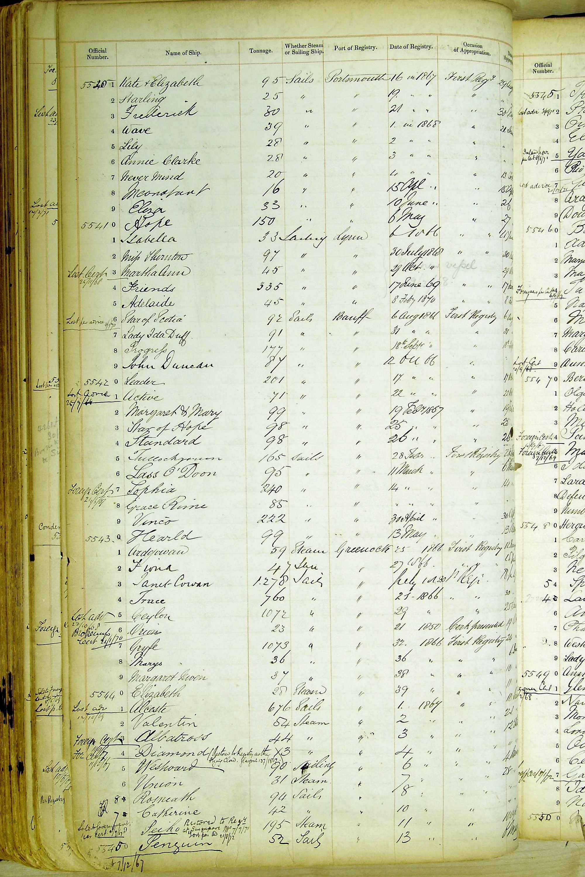 Especially in the first volume, there are frequent margin annotations against the entries which (if you can decipher them) can provide information on the ultimate fate of the ship. Typical entries are 'Lost as per cert[ificate] 20/6/58' or 'Sold foreigners per advice 8/4/67'. Beware - it is sometimes not easy to see which entry it refers to. However, these annotations may be a useful quick alternative to consulting the original Shipping Registers.