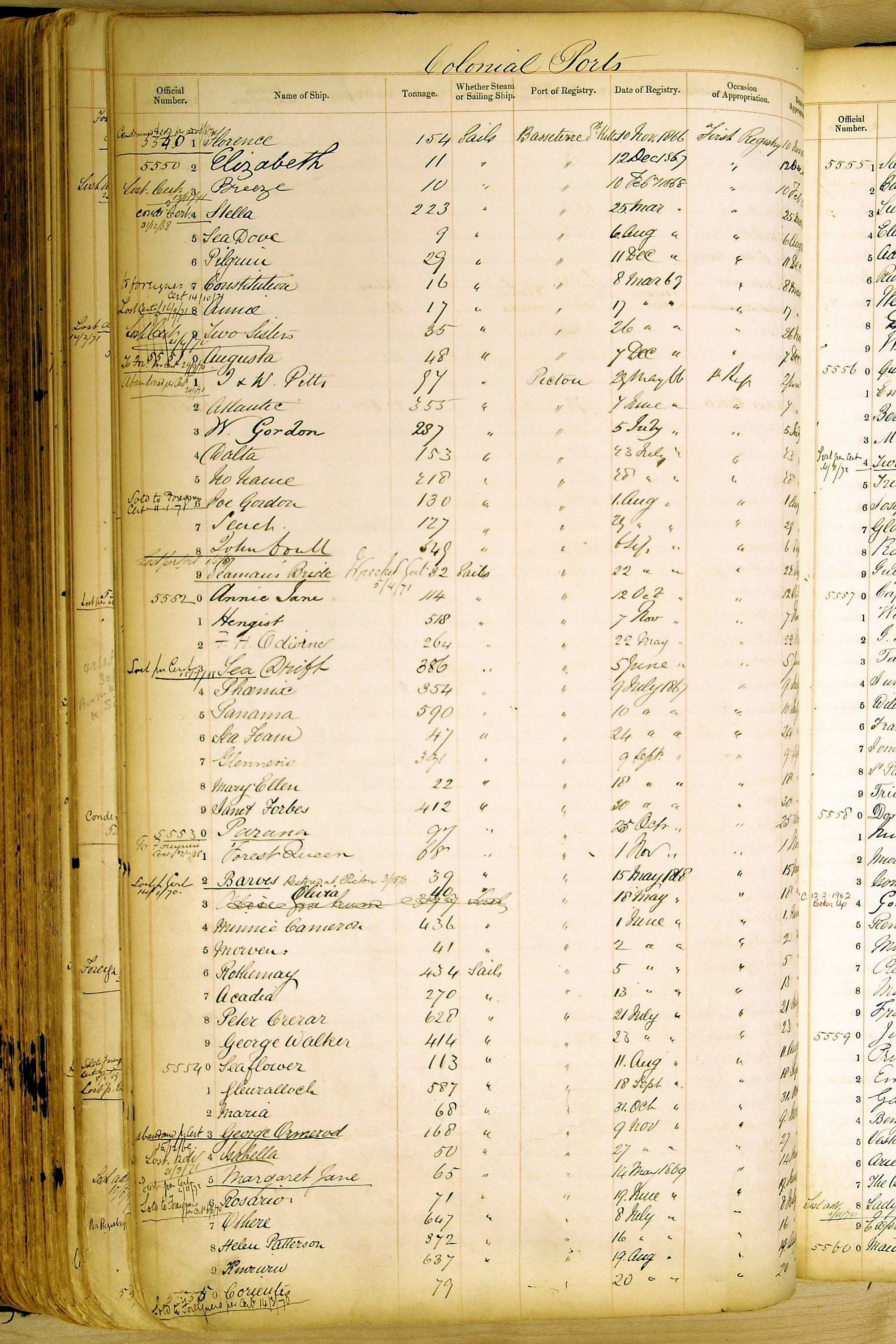 Especially in the first volume, there are frequent margin annotations against the entries which (if you can decipher them) can provide information on the ultimate fate of the ship. Typical entries are 'Lost as per cert[ificate] 20/6/58' or 'Sold foreigners per advice 8/4/67'. Beware - it is sometimes not easy to see which entry it refers to. However, these annotations may be a useful quick alternative to consulting the original Shipping Registers.